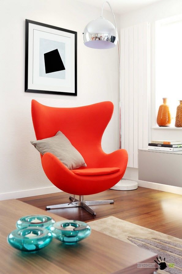 Уголок для чтения был организован с помощью удобного вращающегося кресла ярко-красного оттенка и напольного торшера дуговой модификации, хромированные поверхности которого отлично блестят на белом фоне стен. Настенный декор в зоне чтения весьма контрастен и геометричен.