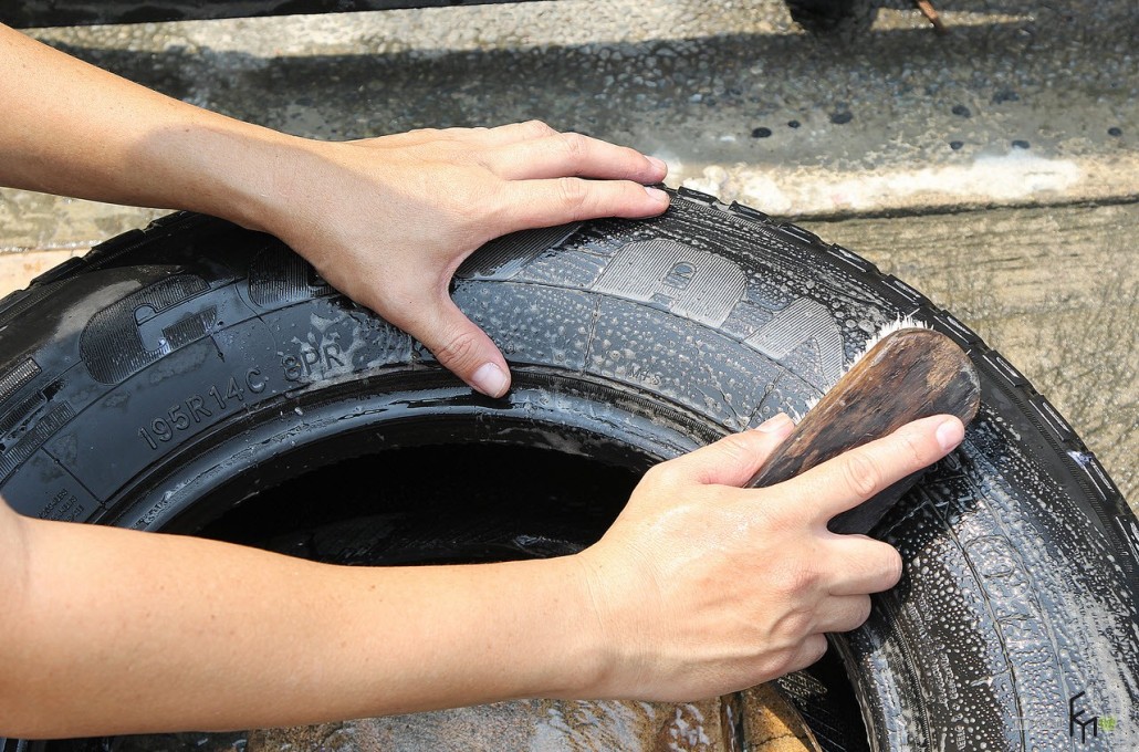 Тщательно вымойте покрышку внутри и снаружи с чистящим средством.