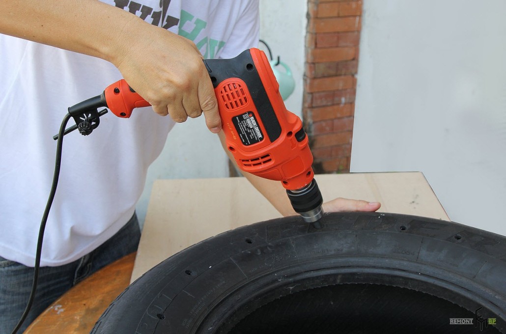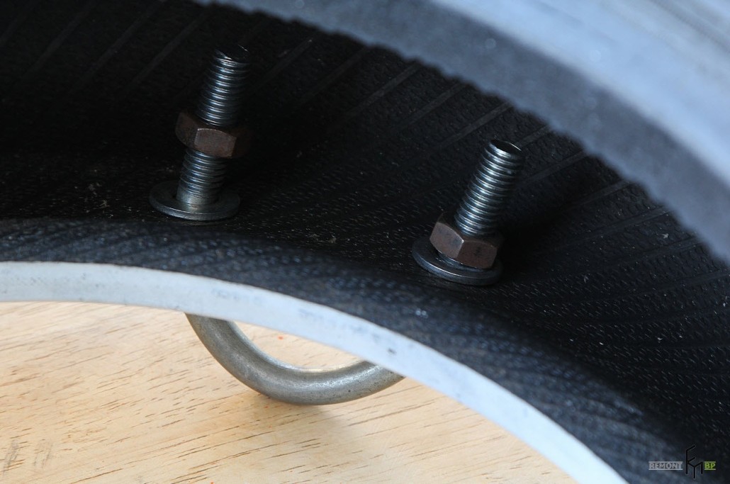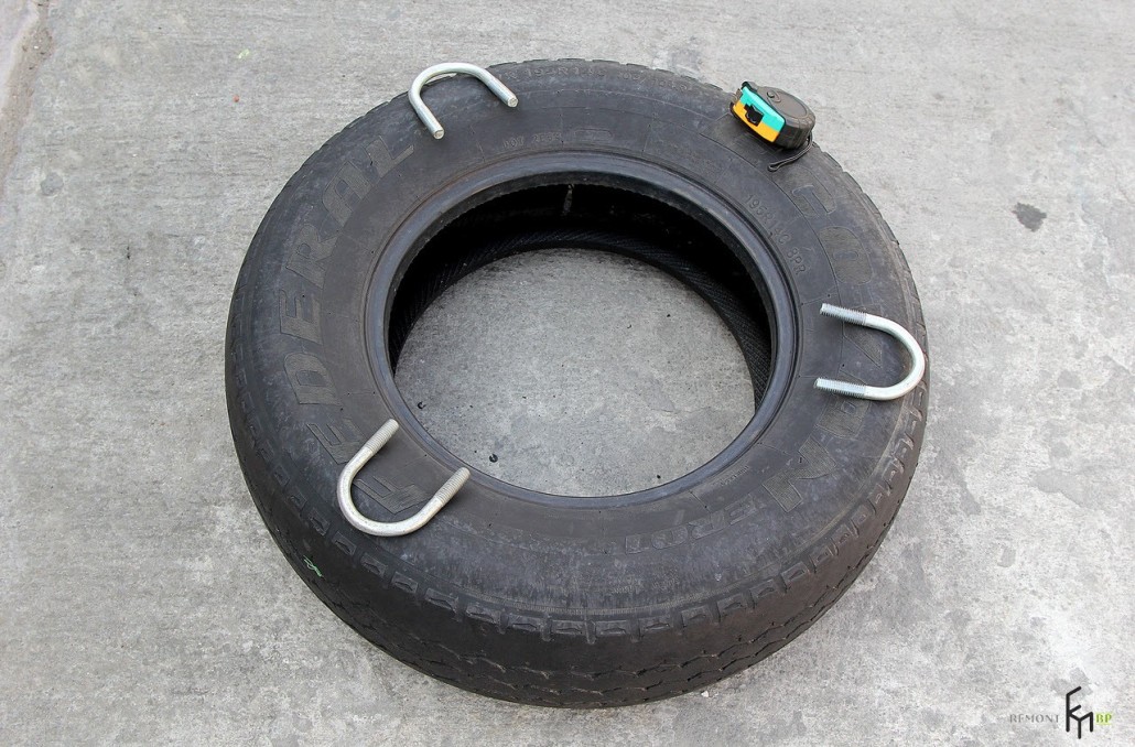 К каждому из болтов в покрышке нужно присоединить крепление с цепью.
