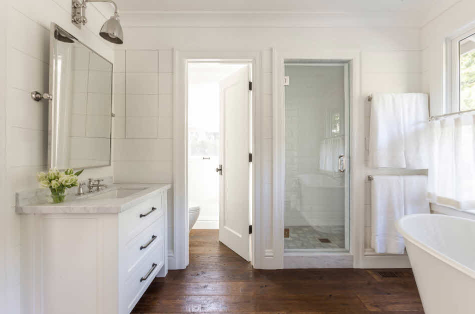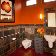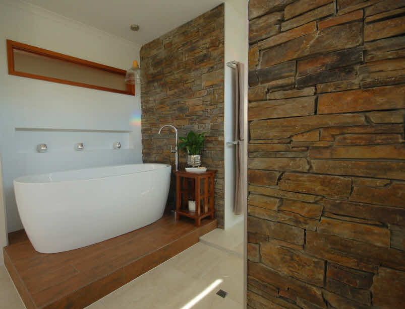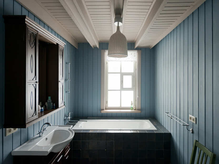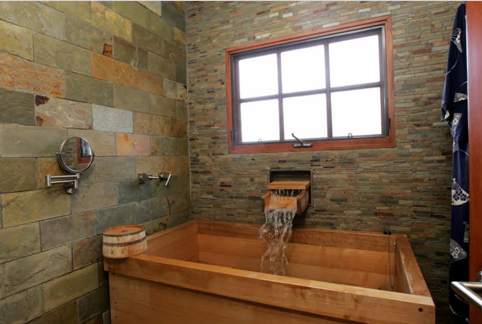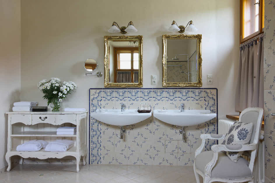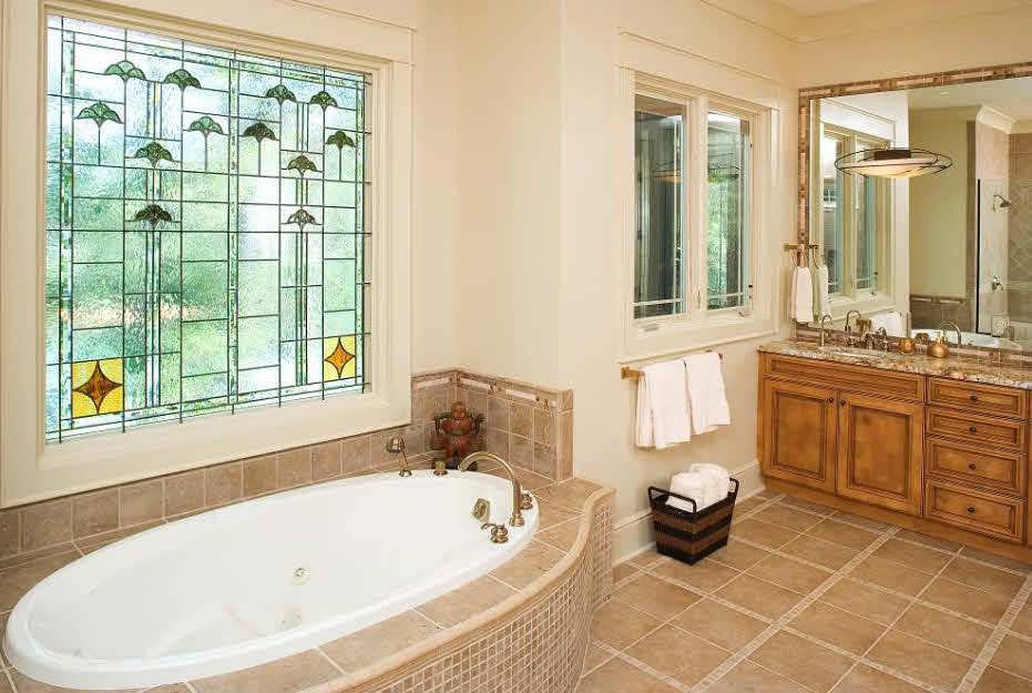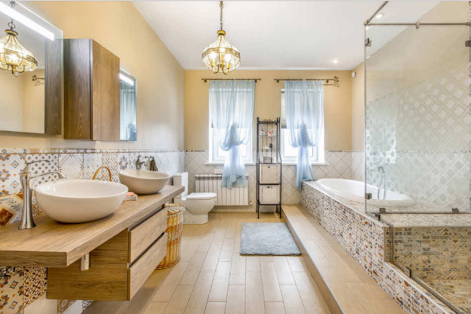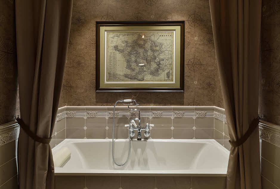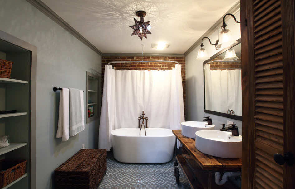 В последнее время все большее количество домовладельцев предпочитают оформление помещений в стиле кантри. Данный стиль сочетает в себе применение натуральных материалов (или имитирующих), и природных цветовых гамм. Кафель можно подобрать под дерево или камень. Лучше остановиться на коричневых, кофейных, бежевых и зеленых оттенках. Особое внимание нужно уделить аксессуарам, которые должны сочетаться с оформлением стен и потолков.