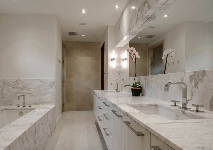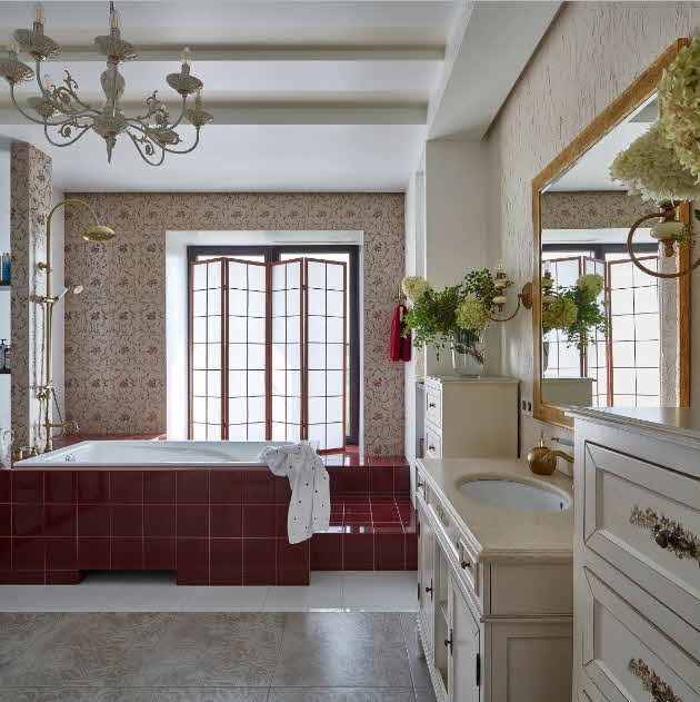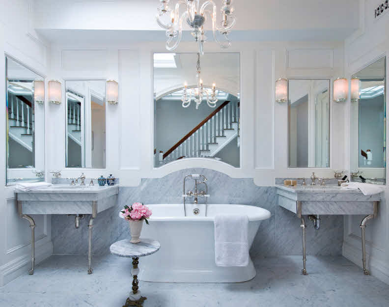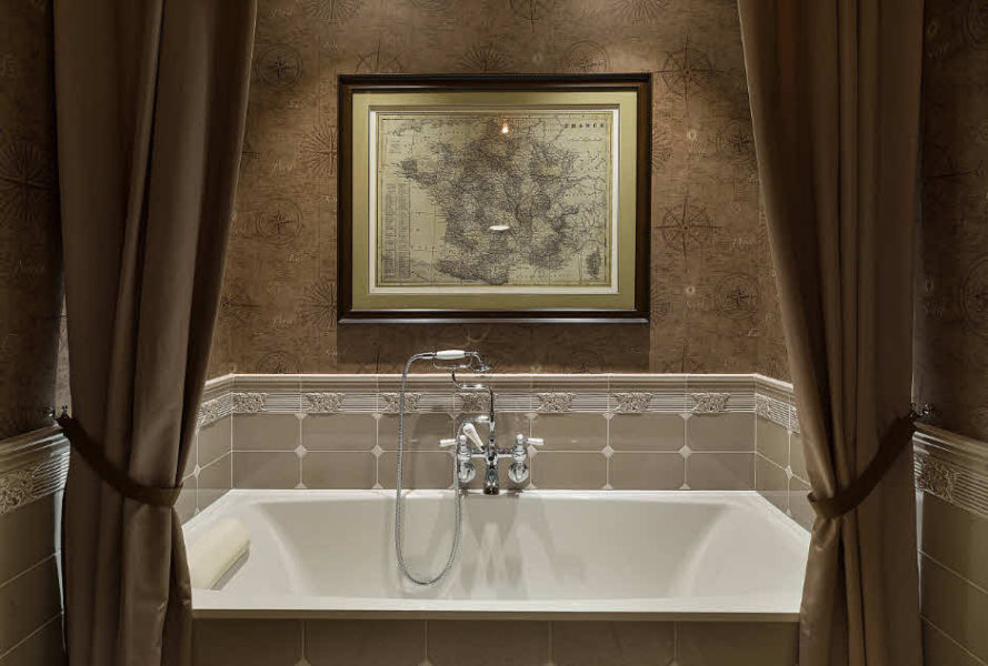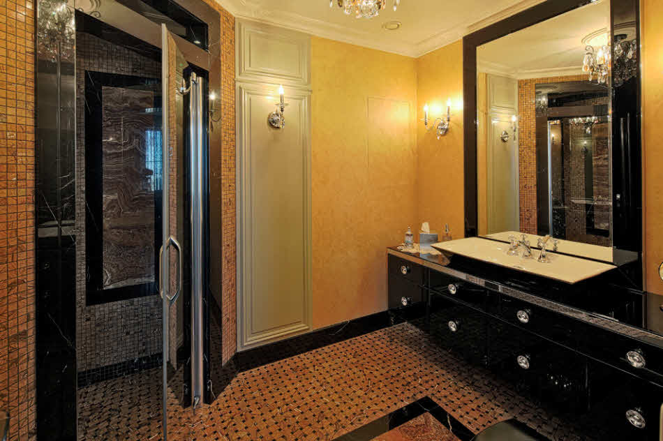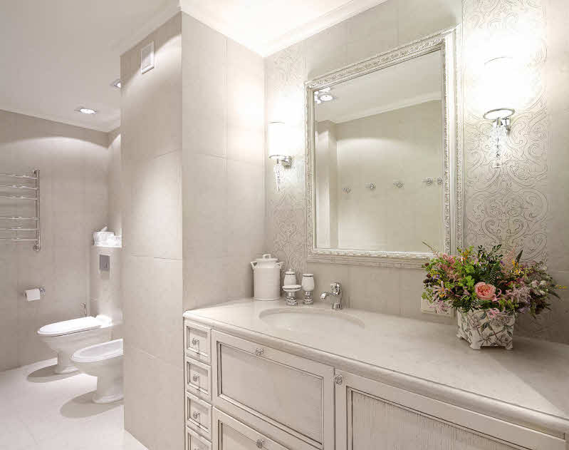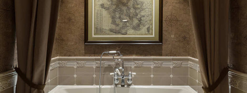 Выбор классического стиля показывает аристократичность хозяина квартиры. Для придания стиля классицизма в интерьере ванной комнаты мало одного оформления стен кафелем – здесь необходимо сочетание с мрамором и ониксом. Важным моментом будет наличие антикварной мебели, сочетающейся с кафелем. Особое внимание нужно уделить мелочам, применяя те же самые плитки по бордюру с мелкими деталями или декор в виде бронзовых элементов. Нужно понимать, что этот стиль подойдет исключительно для просторных высоких помещений.