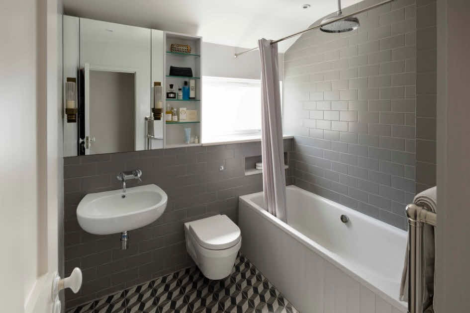 Важным моментом при укладке плитки является ее ориентация: для визуального увеличения высоты комнаты нужно остановиться на вертикальном варианте укладки. Полы же более выгодно для увеличения пространства выкладывать по диагонали.
