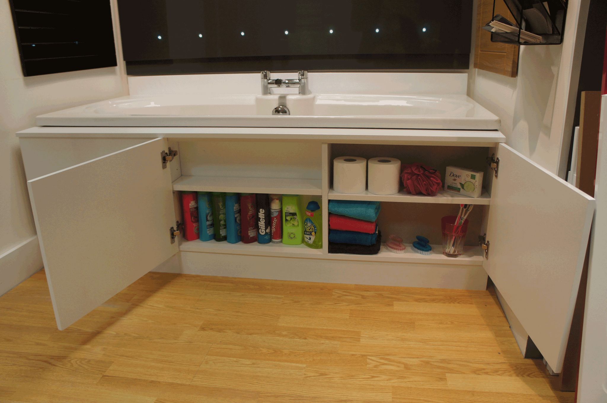 Не самый дешевый, но очень аккуратный, рациональный и эргономичный вариант – это встроенные полки и ящики под ванной, подобно системам хранения классического комода. Изготавливаются такие изделия по индивидуальному заказу. Экран для ванной в этом случае оснащается дверцами, которые закрываются и открываются с помощью различной мебельной фурнитуры: классических ручек или защёлкивающимися доводчиками.