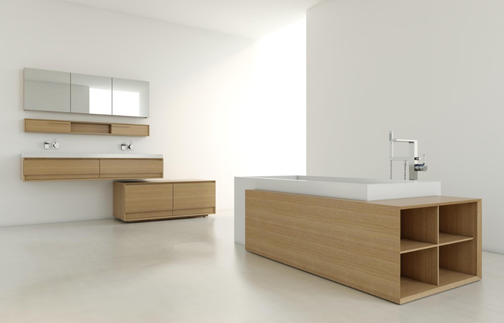 Обустройство пространства под ванной с помощью полноценных мебельных изделий в виде шкафчиков и закрытых полок – один из самых дорогостоящих, красивых и практичных вариантов. Такие системы хранения доступны только по индивидуальному заказу, а также они требуют вложений в виде качественных, дорогих, натуральных материалов, например, специально обработанного влагостойкого дерева. Все затраты с лихвой компенсируются отличным, высококачественным и эффектным результатом.