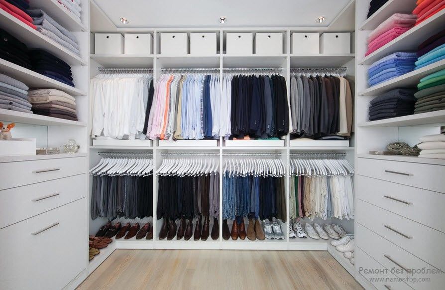 Идеальным вариантом станет обустройство гардеробной в кладовой, чулане или даже на балконе, главное чтобы площадь комнаты была не меньше 2 квадратных метров. Также ее можно оборудовать в одном из углов самой большой комнаты квартиры. Главное, чтобы вся модульная система гармонично вписалась в стилистику помещения. Если место для гардероба подобрано остается лишь определиться с планировкой и распределением полок, ящичков и прочих комплектующих. Здесь есть два варианта: