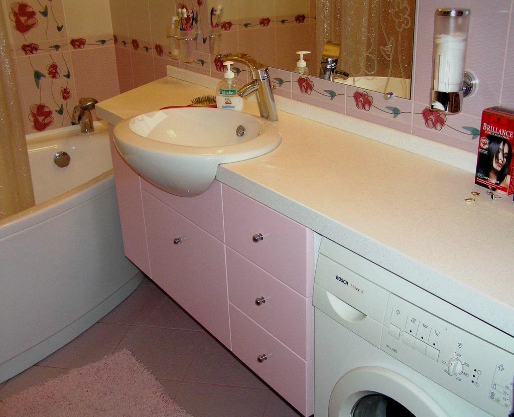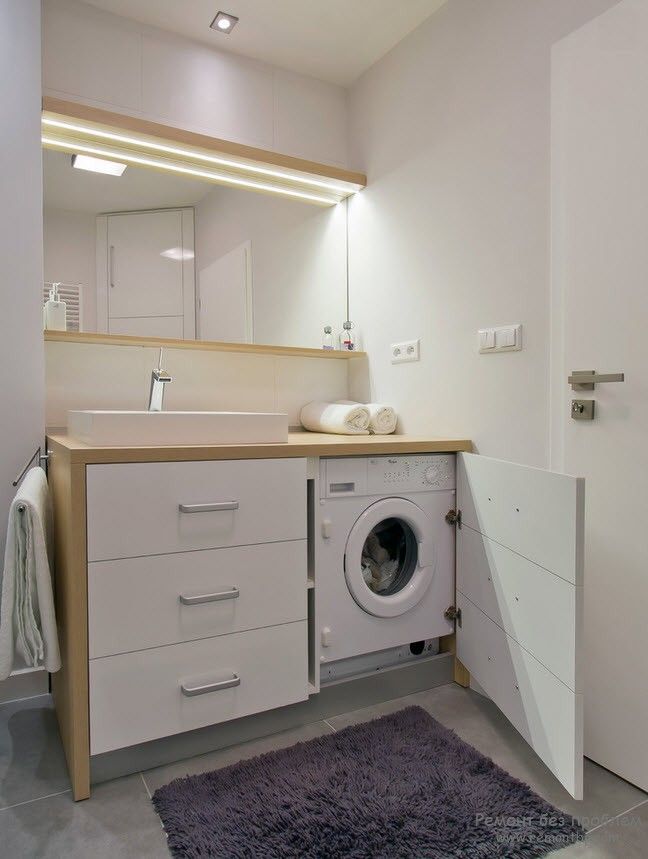 - стиральную машину можно поставить рядом с умывальником, а для гармоничного вида объединить их цельной столешницей, в этом случае легко можно будет на стене над столешницей прикрепить огромное зеркало, что визуально расширит ванную.