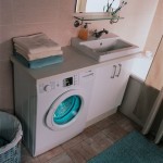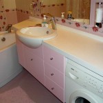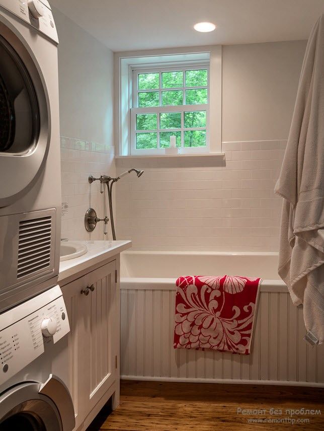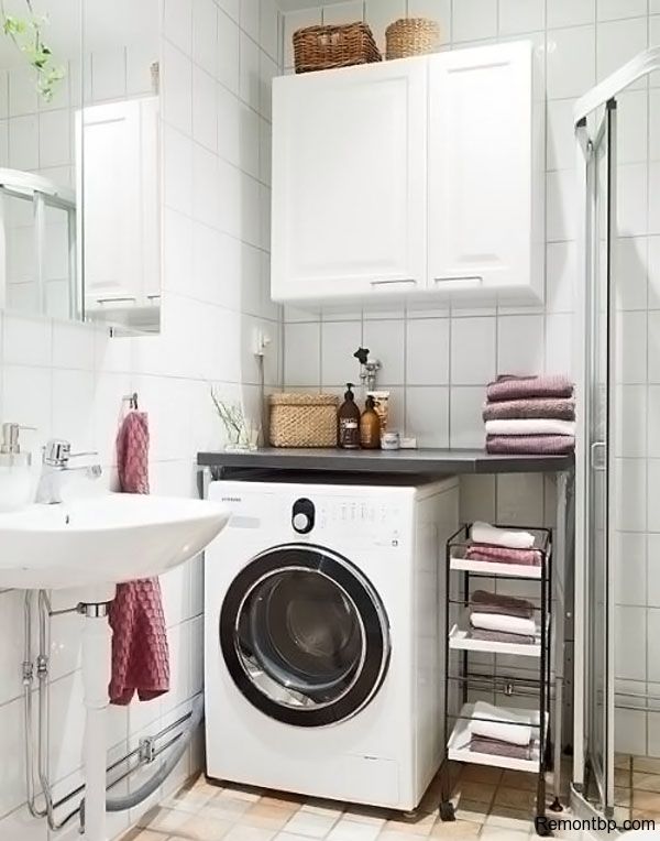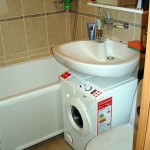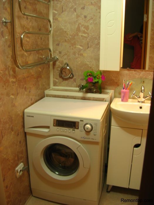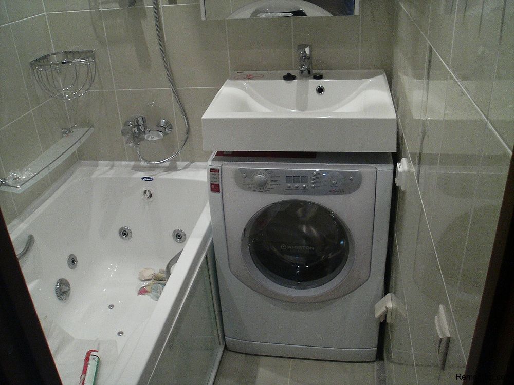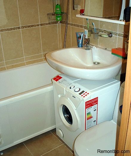 - компактную стиральную машину можно разместить под умывальником с боковым сливом – вариант нестандартный, но в плане экономии площади очень даже эффективный;
