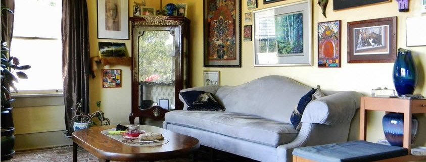 Поистине эффектную галерею на стене можно создать из фотографий в сочетании с картинами, гравюрами, постерами. Здесь можно проявить фантазию, подбирая интересные асимметричные сценарии и миксуя произведения искусства разных жанров.