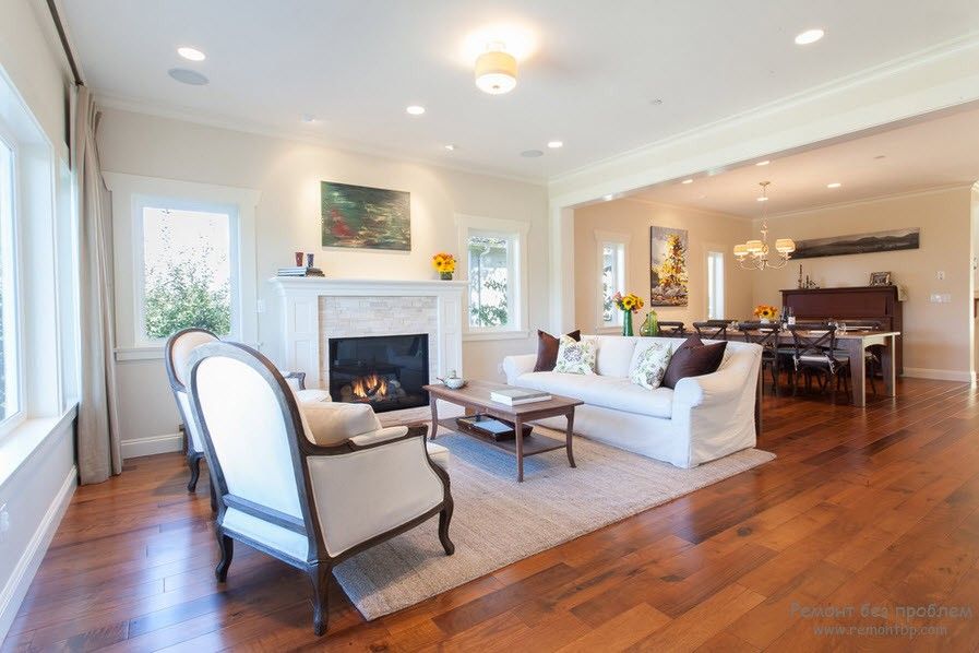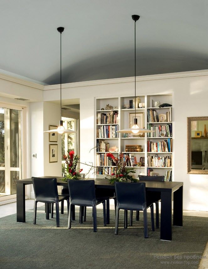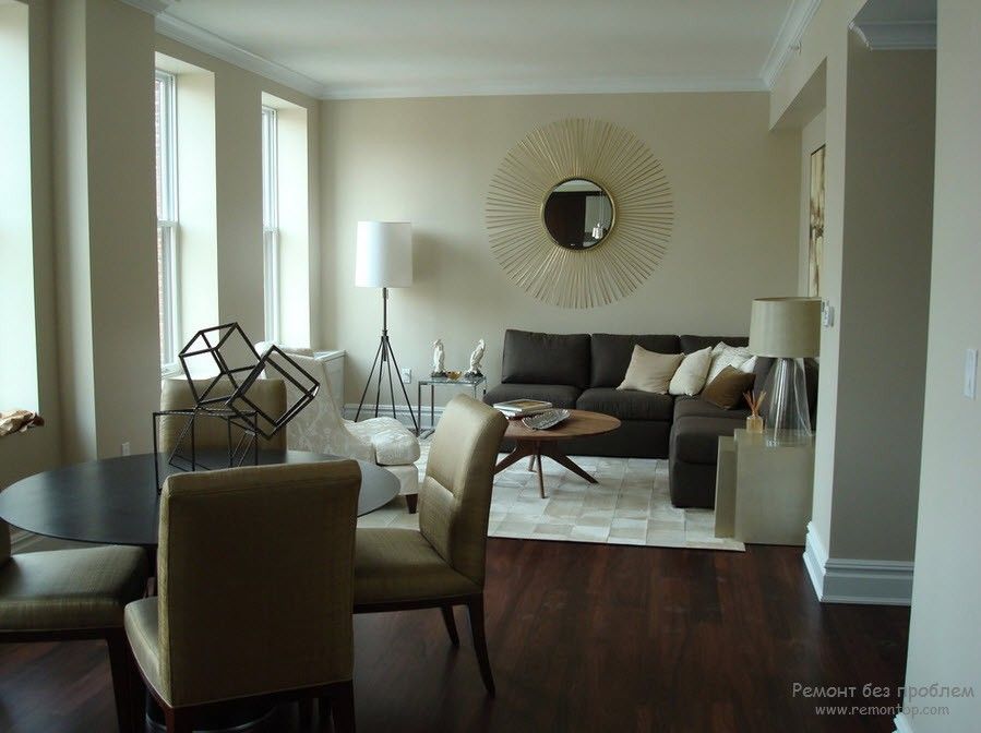 Обычно такие комнаты достаточно больших размеров, а это значит, что сложностей с расстановкой мебели будет гораздо меньше, чем в случаях с маленькими комнатами. Вначале можно на листке бумаге начертить импровизированный план расстановки мебели и зоны комнаты: где будет стоять обеденный стол и стулья, где будет находиться телевизор, диван и кресла, а где будут размещаться цветы и шкафы с полками книг и других разных предметов и аксессуаров. Это будет хорошим подспорьем для дальнейшего проектирования.