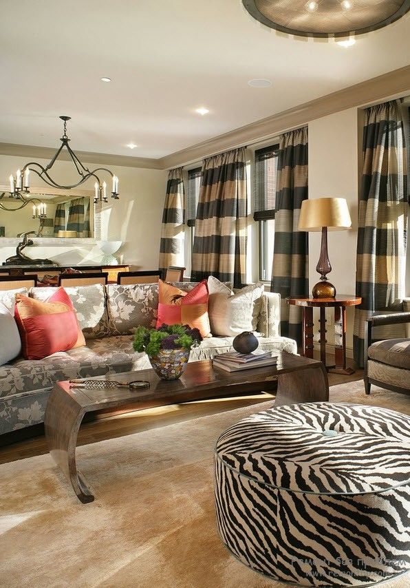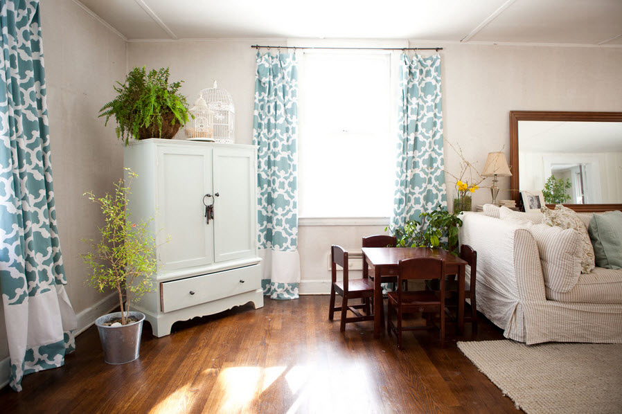 Обращают внимание и на ткань штор. Материал одного цвета без каких-либо рисунков гораздо проще совместить с интерьером жилища. Если же хочется шторы с узорами, то они должны сочетатся с рисунками обоев, коврами или с обивкой мебели. Главную роль играет здесь размер узора, и его тематика. Но увлекаться разнообразием узоров не стоит, лучше проследить за контрастностью, чтобы обои и шторы не слились в единый фон: следует выбирать шторы или темнее или светлее, чем цвет на обоях.