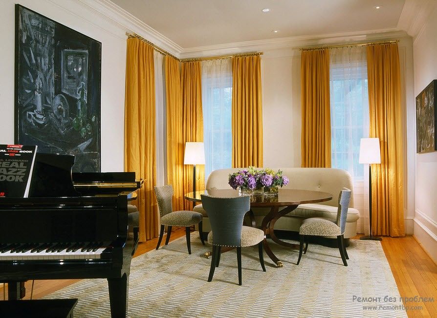 А вот в гостиной просто неограничен полет фантазии. Главное лишь только грамотно подобрать тюль и портьеру под стиль комнаты. А так здесь можно экспериментировать с формой, цветом и фактурой штор сколько душе угодно.