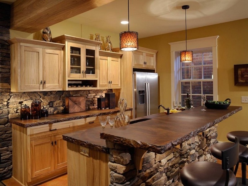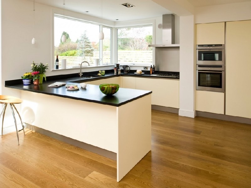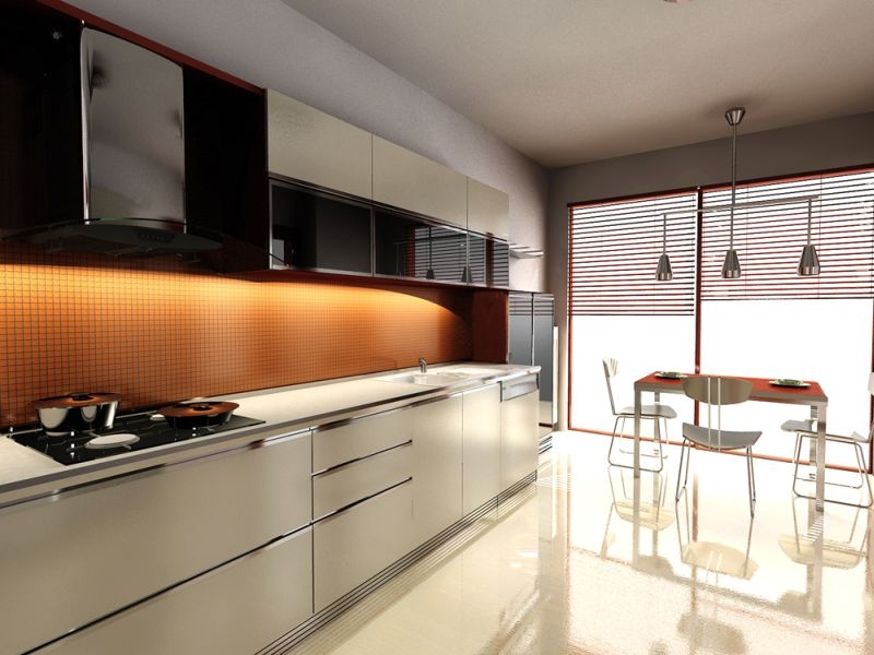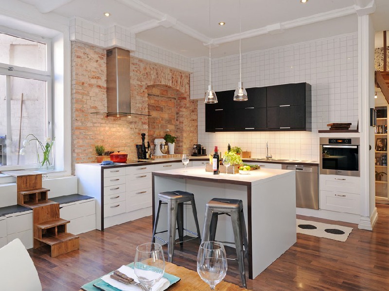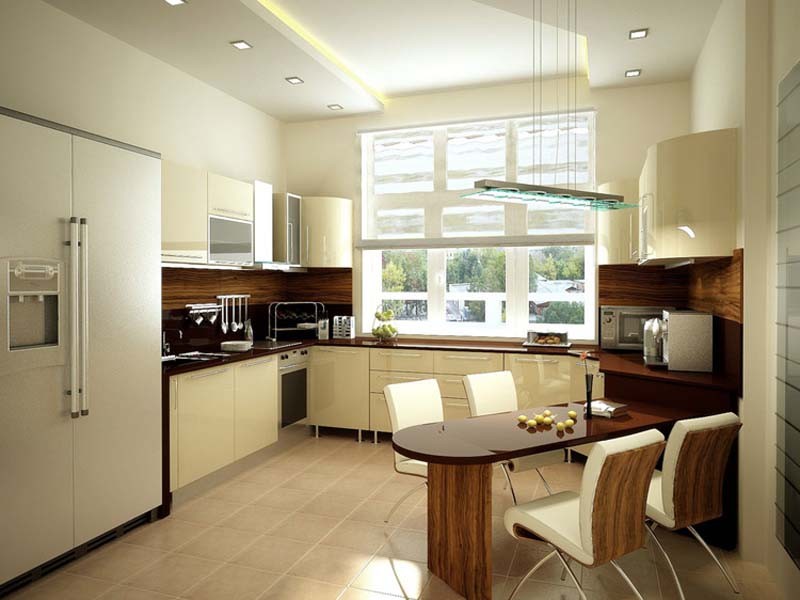 Если же предпочтительнее кухня-студия (имеется в виду совмещенный вариант, обычно с барной стойкой), такой дизайн значительно увеличит кухню минимум в полтора раза, а также превратит жилище в очень модный и современный дом, как это обычно выглядит в европейских или американских квартирах. Однако, подобный вариант подразумевает обязательное зонирование помещения (разделение на разные участки, в зависимости от назначения: для отдыха и для приготовления пищи). Чаще всего границей этих участков служит одно- или двухуровневая барная стойка, разделяющая кухню с залом. Относительно бытовой техники, то совершенно не лишним будет разместить дополнительную технику на кухне, к примеру, стиральную машинку, причем, также необходимо определиться, какая техника вам больше по душе: встроенная или самая обычная.