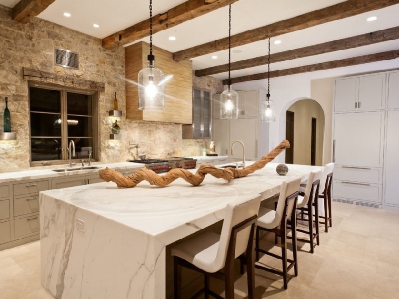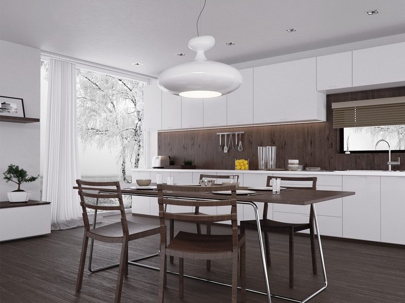 Если же хозяева склонны к теплым семейным и дружеским беседам на кухне, в таком случае наилучшим образом подойдет вариант кухни-столовой, дизайн которой также основан на разделении рабочей и обеденной зоны при помощи той же барной стойки, а также кухонного гарнитура или других дизайнерских приемов.