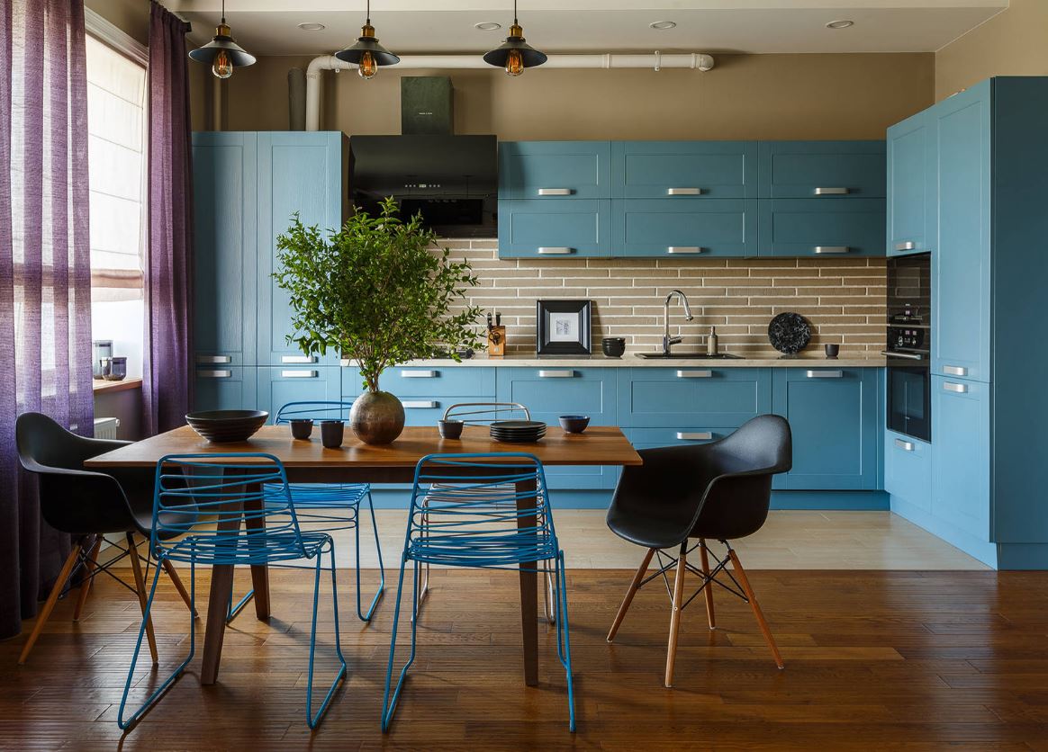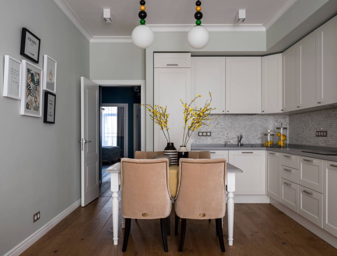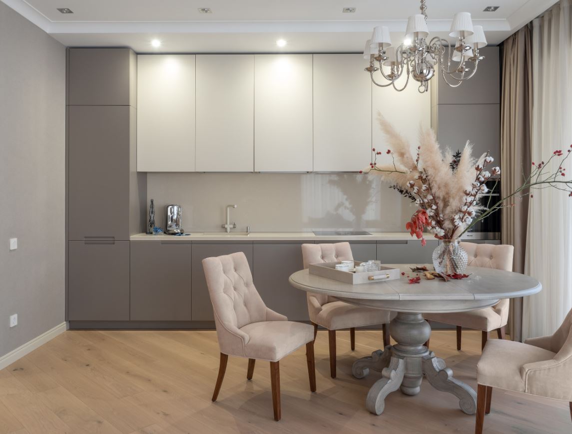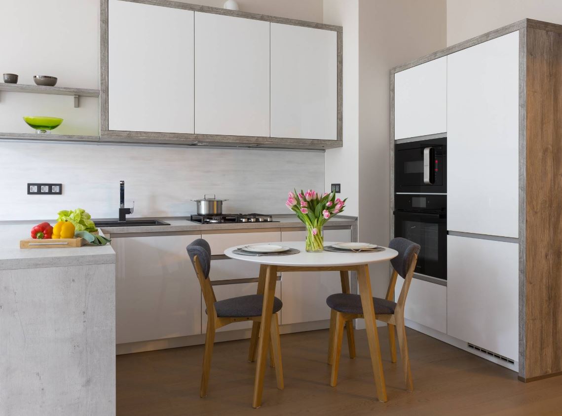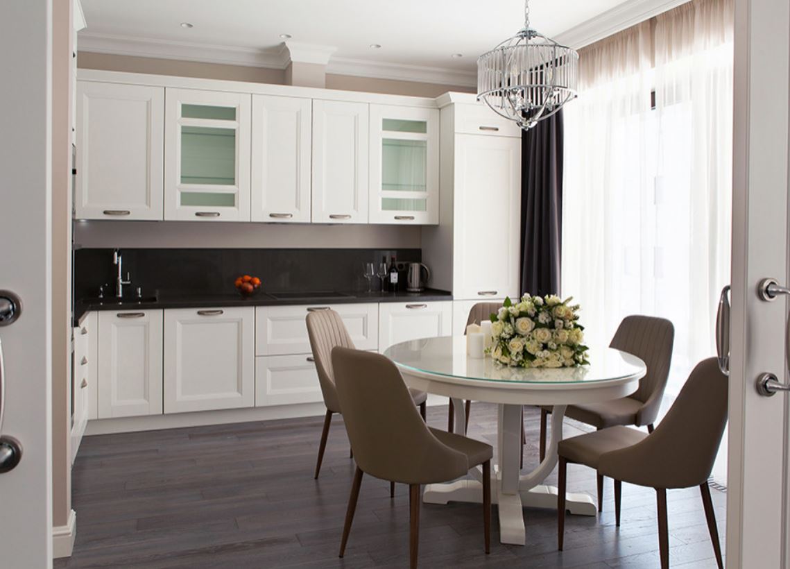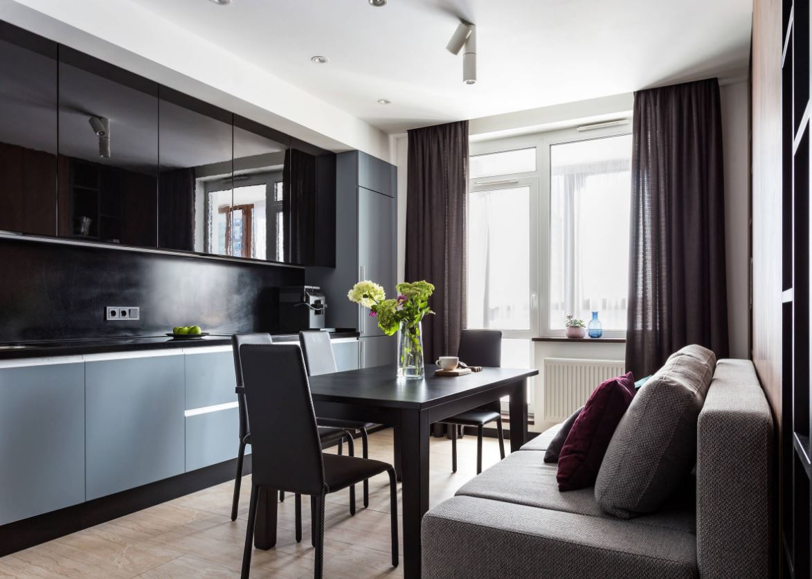 При этом не всегда хватает шкафчиков, чтоб заполнить все поверхности стен. Поэтому одну заполняют мебелью полностью, а вторую дополняют столовой группой. Рекомендуемое расстояние между шкафами должно составлять от 1,5 до 2 метров.