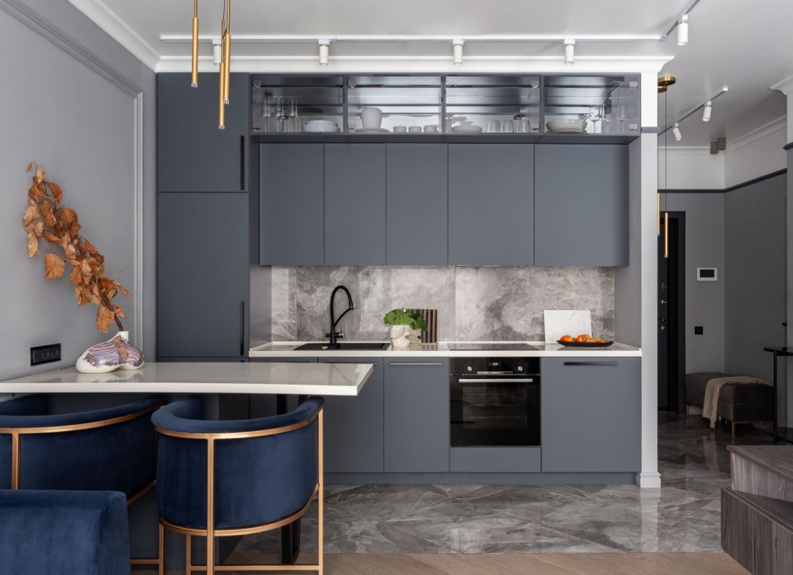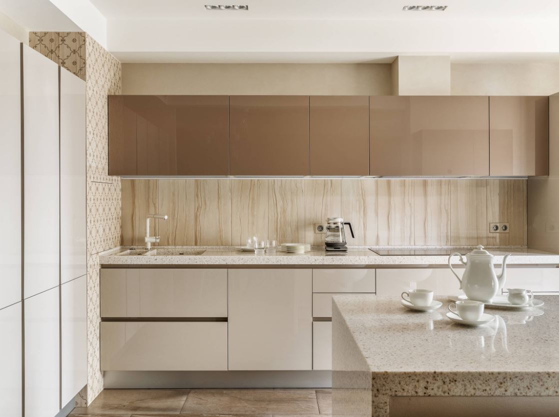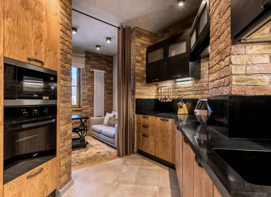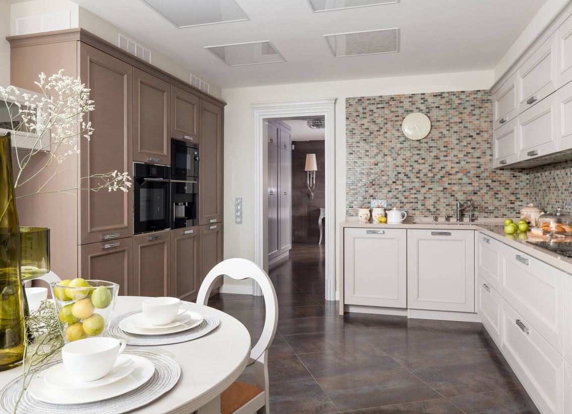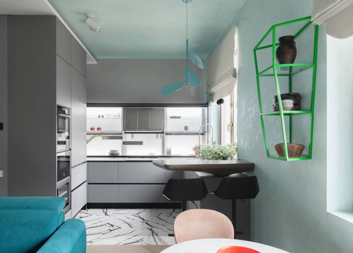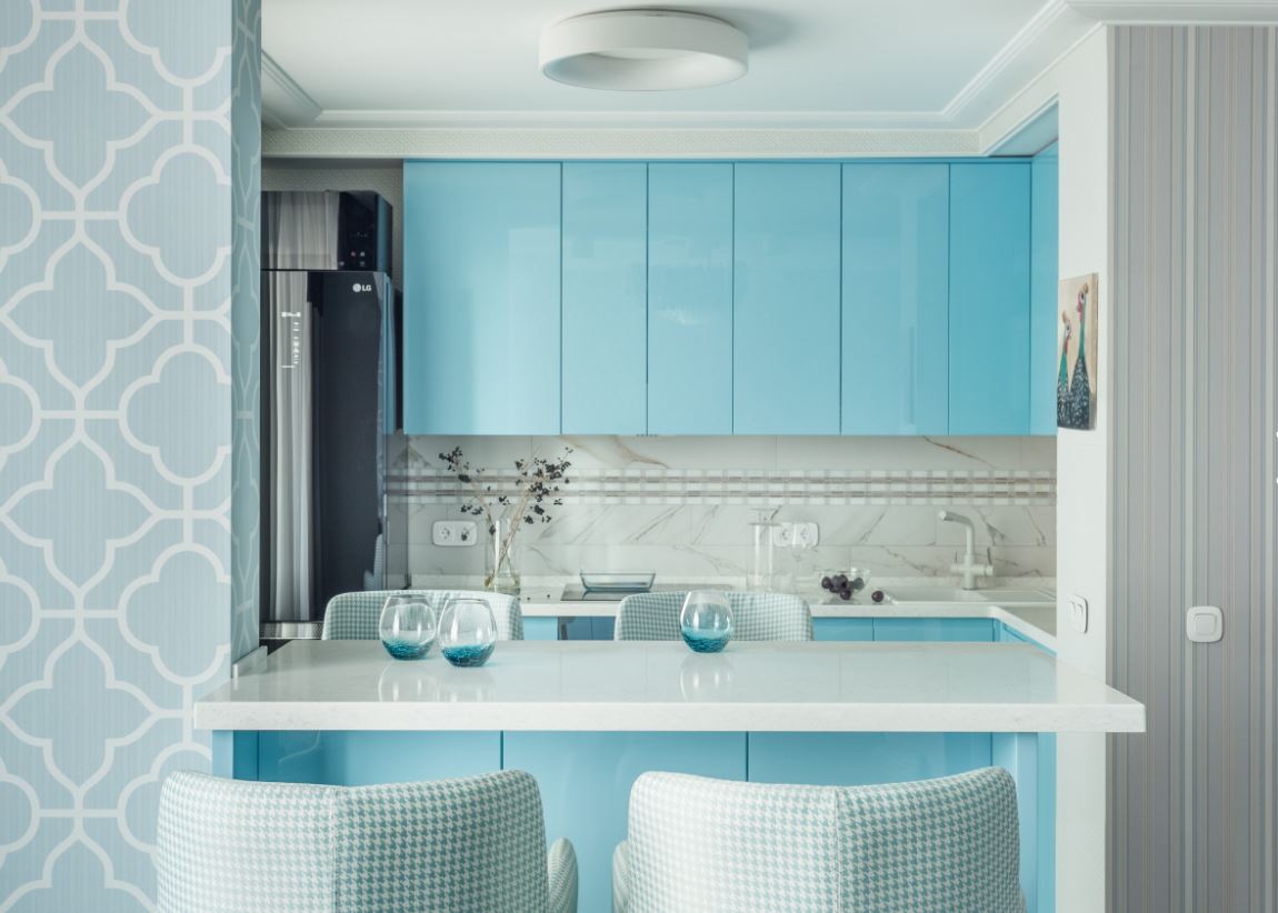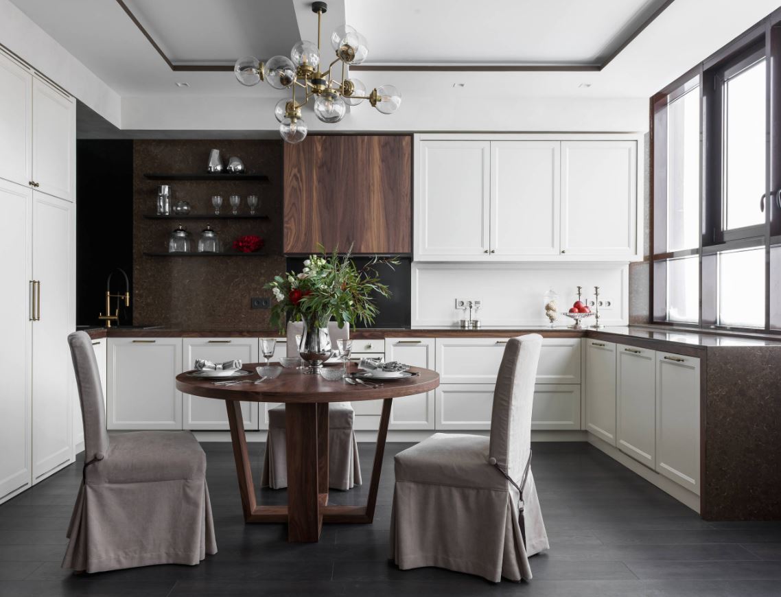При этом не всегда хватает шкафчиков, чтоб заполнить все поверхности стен. Поэтому одну заполняют мебелью полностью, а вторую дополняют столовой группой. Рекомендуемое расстояние между шкафами должно составлять от 1,5 до 2 метров.