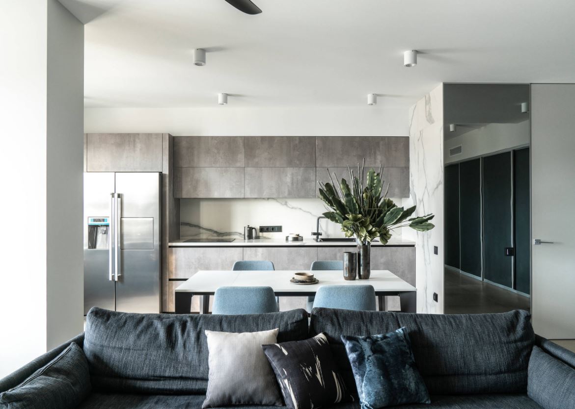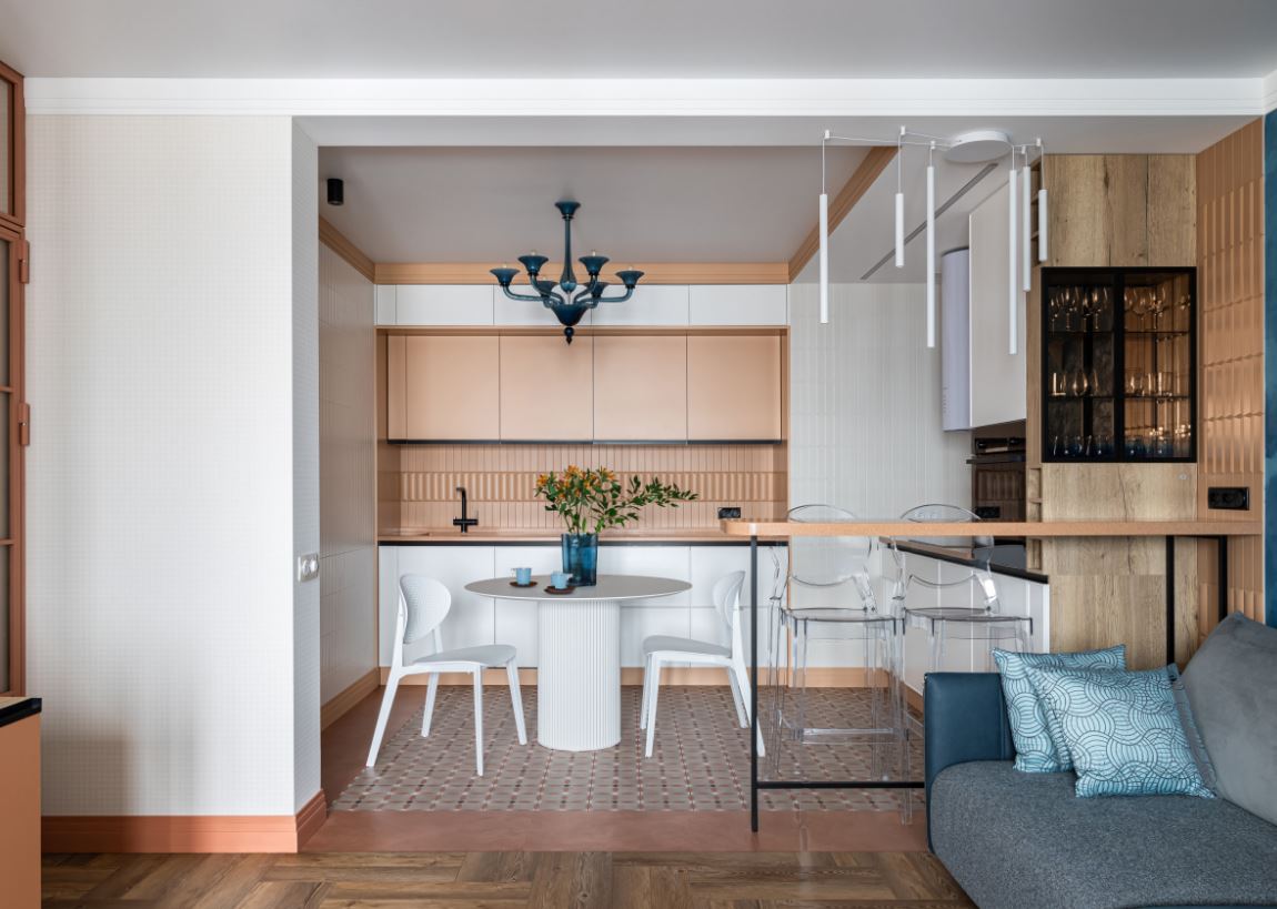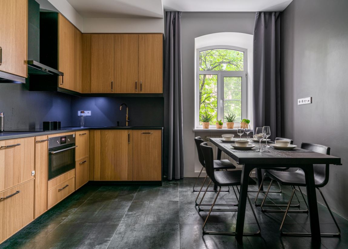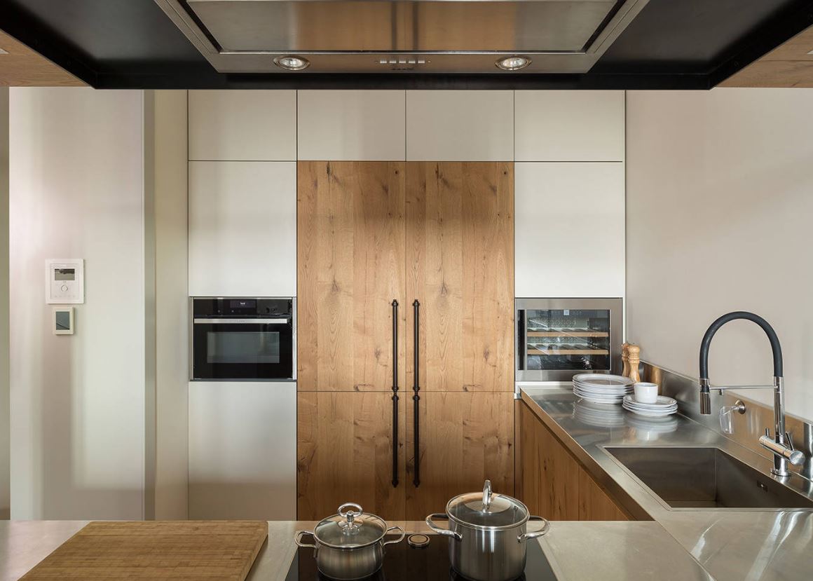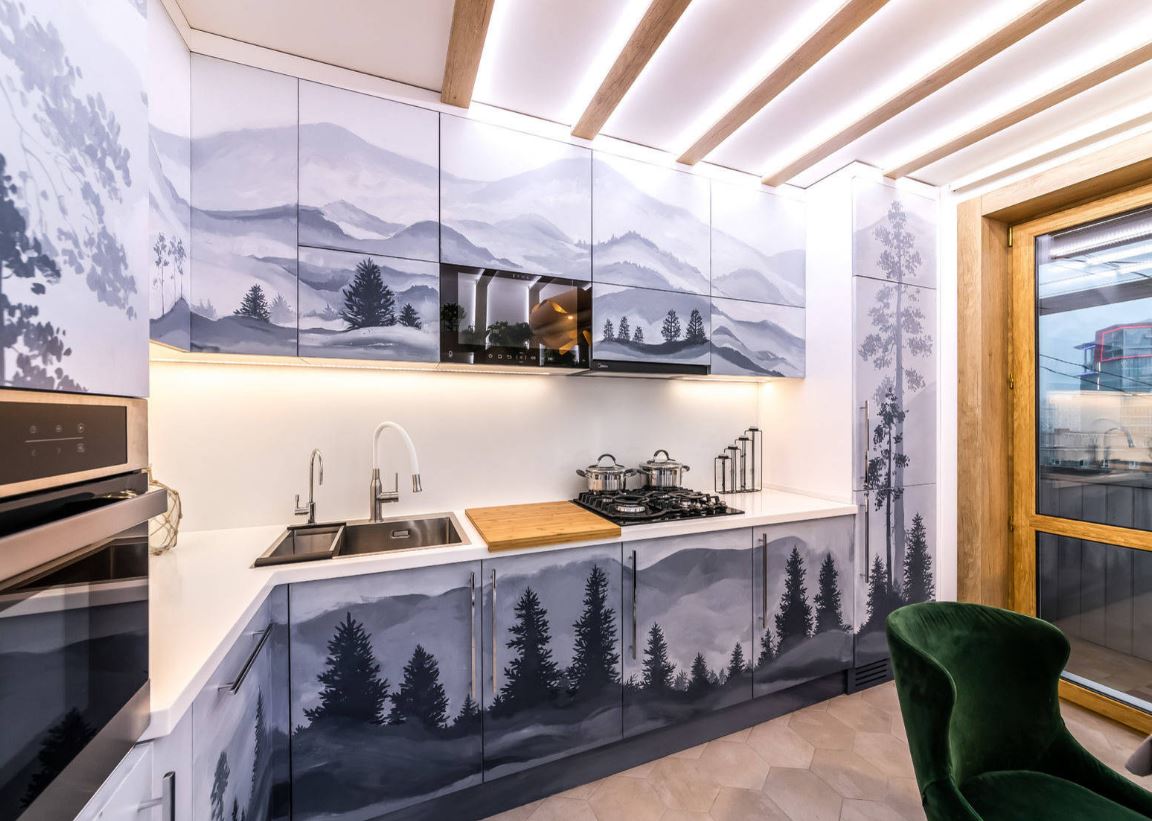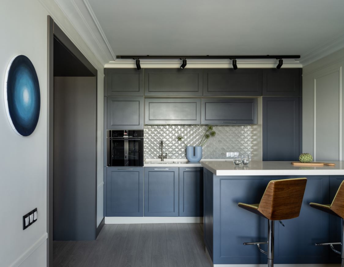При этом не всегда хватает шкафчиков, чтоб заполнить все поверхности стен. Поэтому одну заполняют мебелью полностью, а вторую дополняют столовой группой. Рекомендуемое расстояние между шкафами должно составлять от 1,5 до 2 метров.