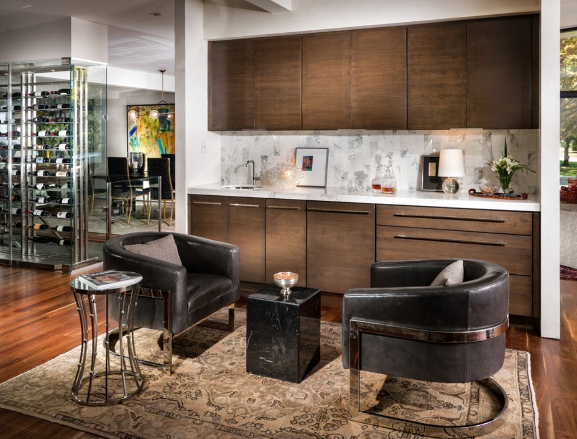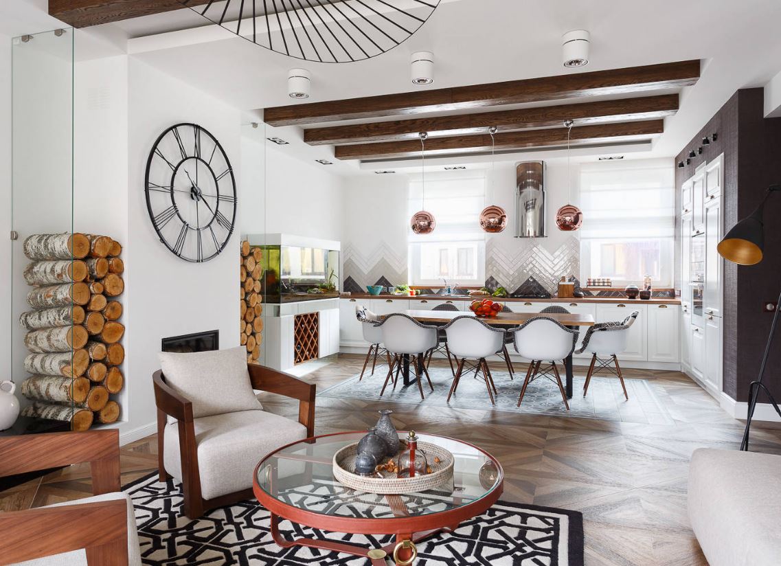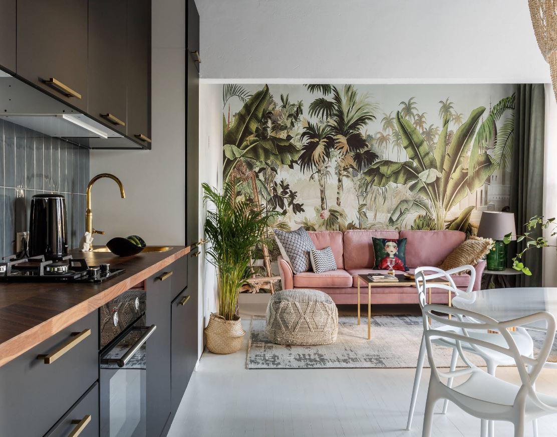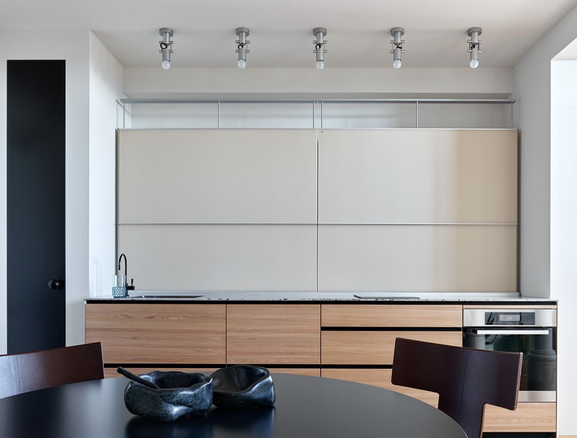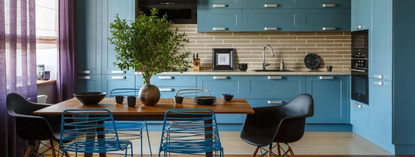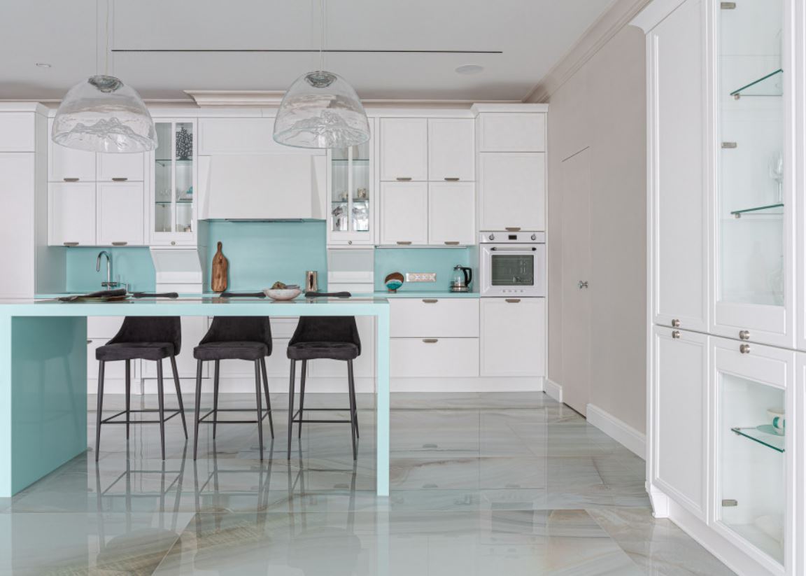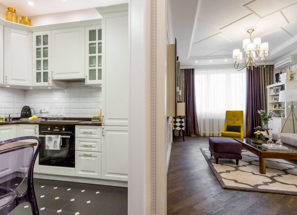При этом не всегда хватает шкафчиков, чтоб заполнить все поверхности стен. Поэтому одну заполняют мебелью полностью, а вторую дополняют столовой группой. Рекомендуемое расстояние между шкафами должно составлять от 1,5 до 2 метров.