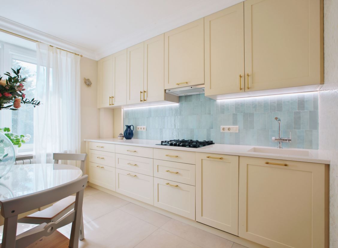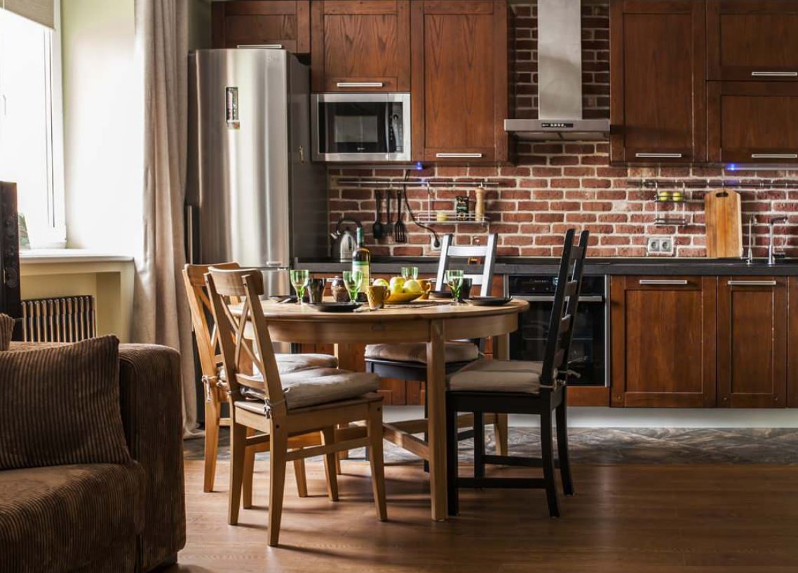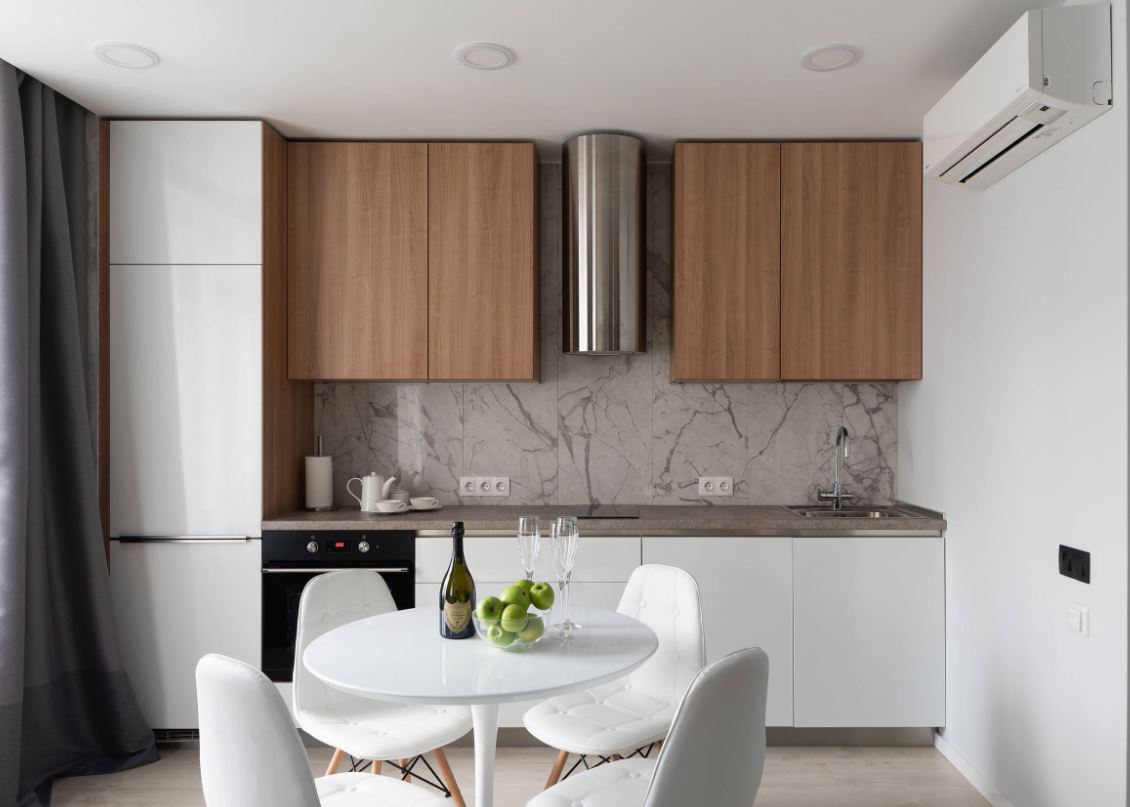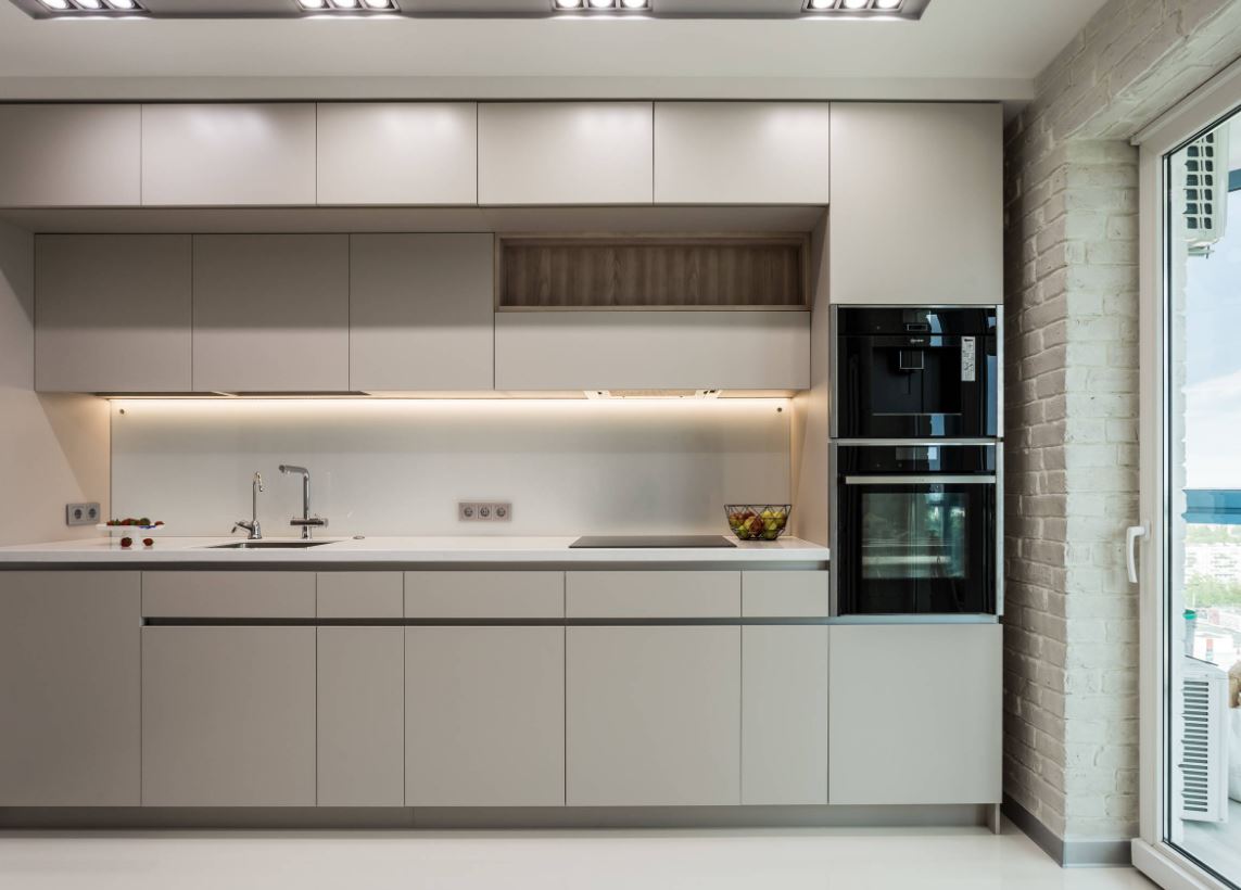 В некоторый случаях линейной планировки не остается места для плиты, поэтому специалисты рекомендуют устанавливать варочную панель. А обеденный стол можно установить около окна или рядом с противоположной стенкой.