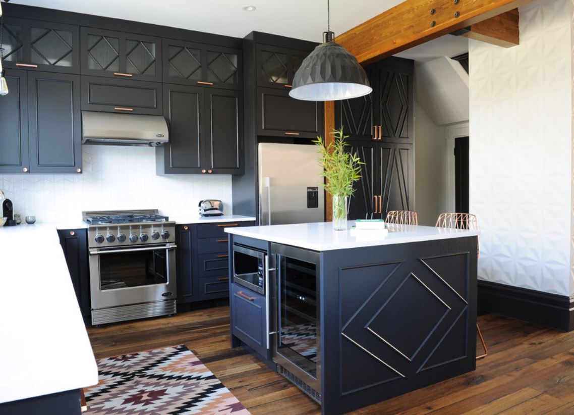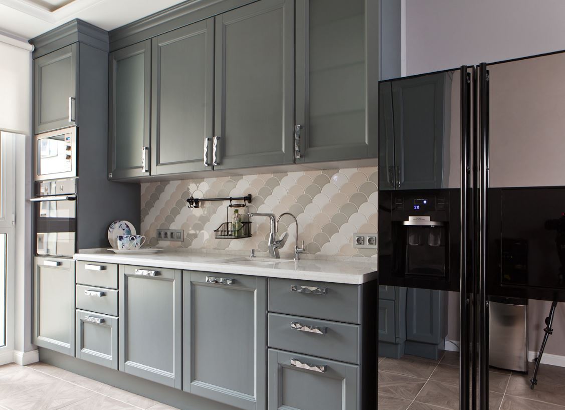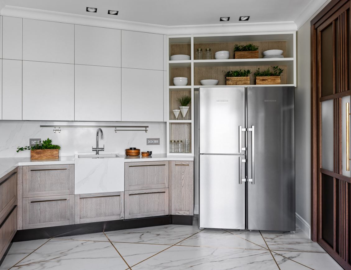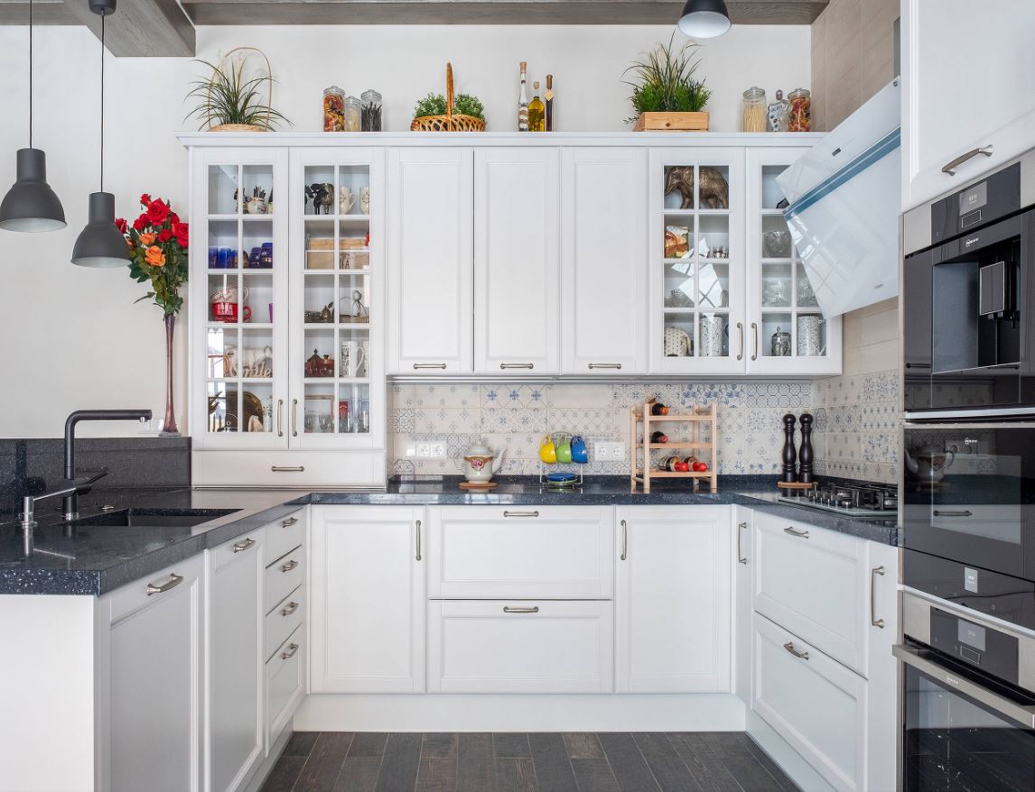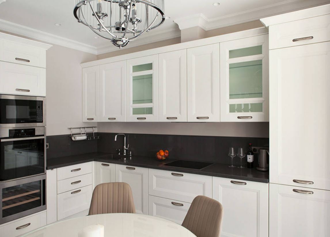 У этой расстановки мебели тоже есть второе название – угловая, так как мебель располагается по двум смежным стенам. Такое решение относится к универсальным, так как допускает использование внутри просторных или наоборот – тесных кухонь. При Г-образной планировке легко соблюсти правило «рабочего треугольника», поэтому процесс готовки максимально комфортный.