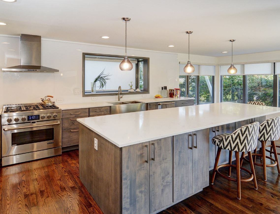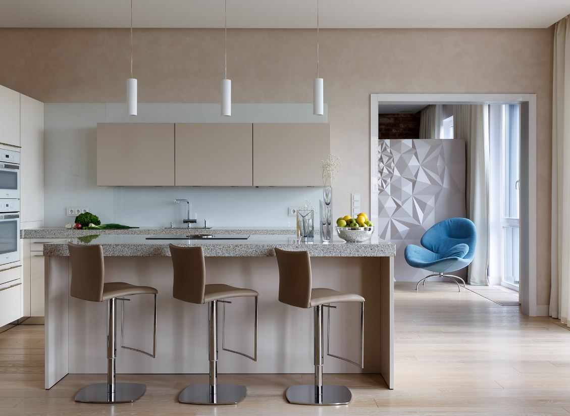 Этот вид планировки считается относительно новым, пришедшим из западных интерьеров. Островная расстановка требует достаточно площади для отдельного острова и некоторых особенностей канализационных систем. Ведь островок обычно содержит мойку или варочную панель, к которым следует подсоединить трубы или провода. Обычно их прокладывают через пол. Кроме того, для островка потребуется отдельное точечное освещение.