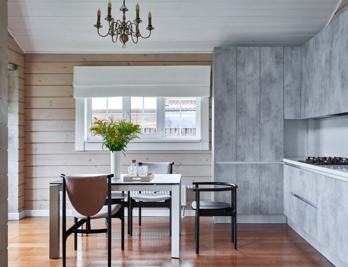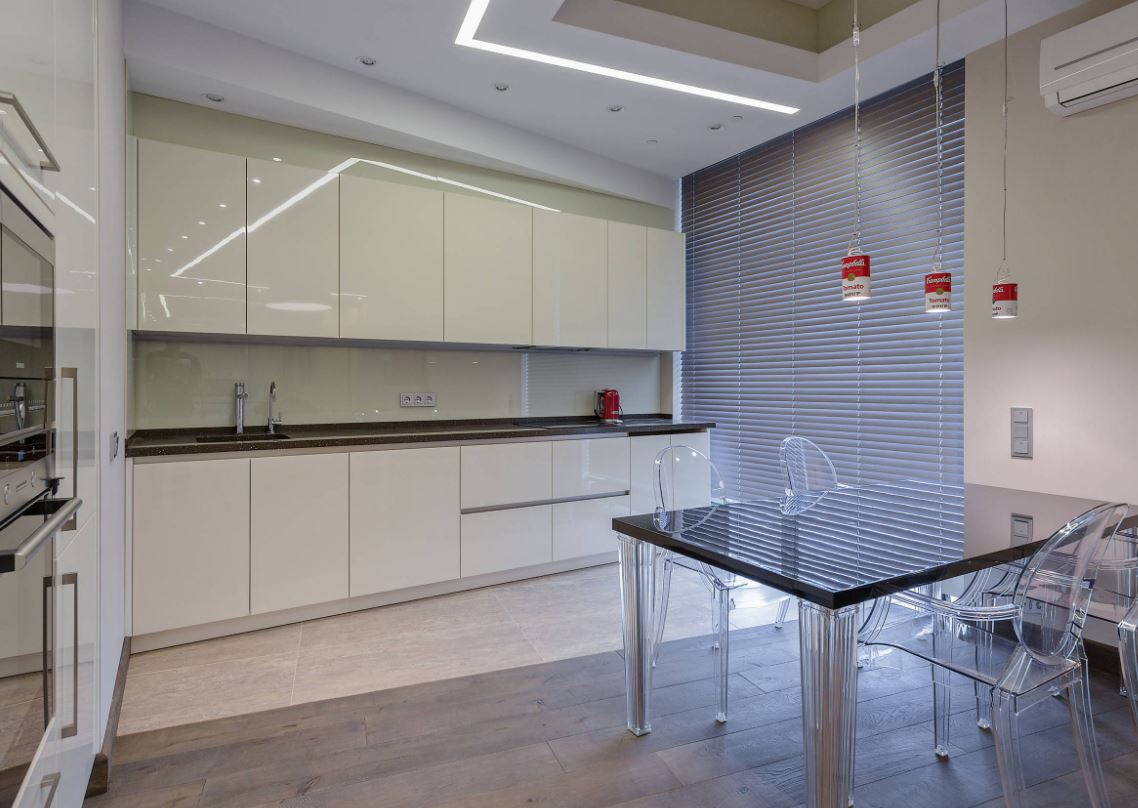 Еще сложнее планировать кухонное пространство при наличии одного или даже двух окон, а также балконной двери. К проемам всегда должен оставаться свободный проход, поэтому линейный гарнитур и столовая группа напротив – идеальный вариант.