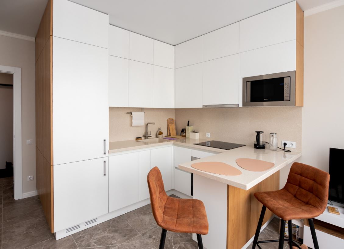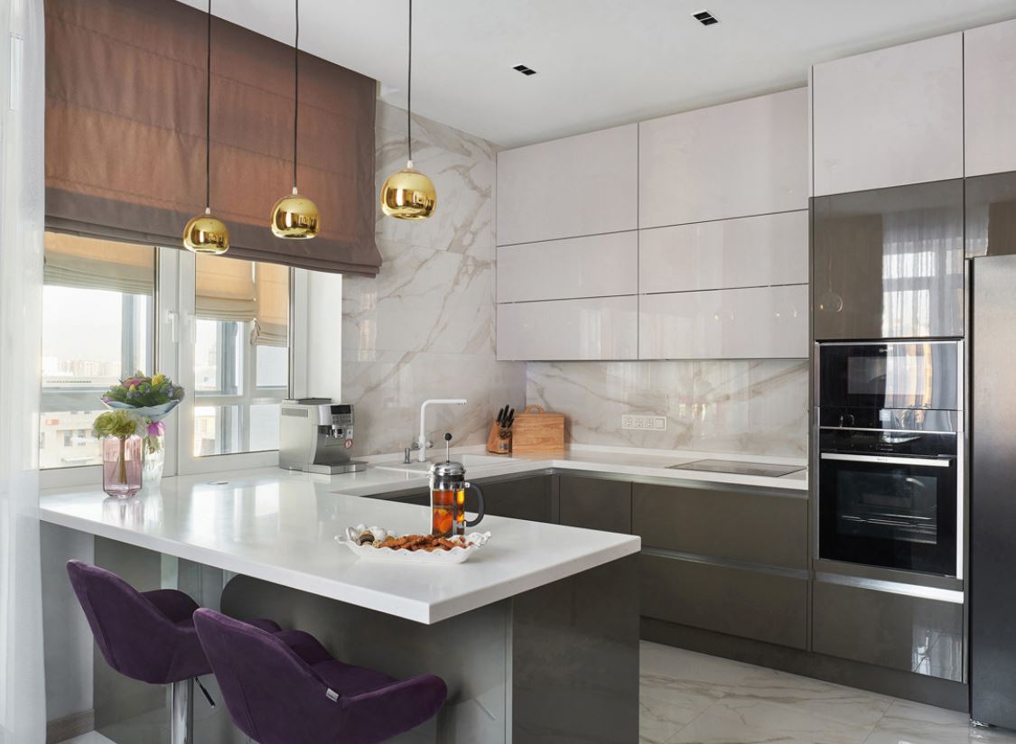 Комбинация островной и линейной планировки представляет собой полуостровное расположение. Подойдет для небольших комнат, где центр кухни занять под остров невозможно. Полуостров предполагает небольшой стол, прилегающий с торца к стене. Нередко вместо стола выступает барная стойка, которая может одновременно являться и обеденным столом.