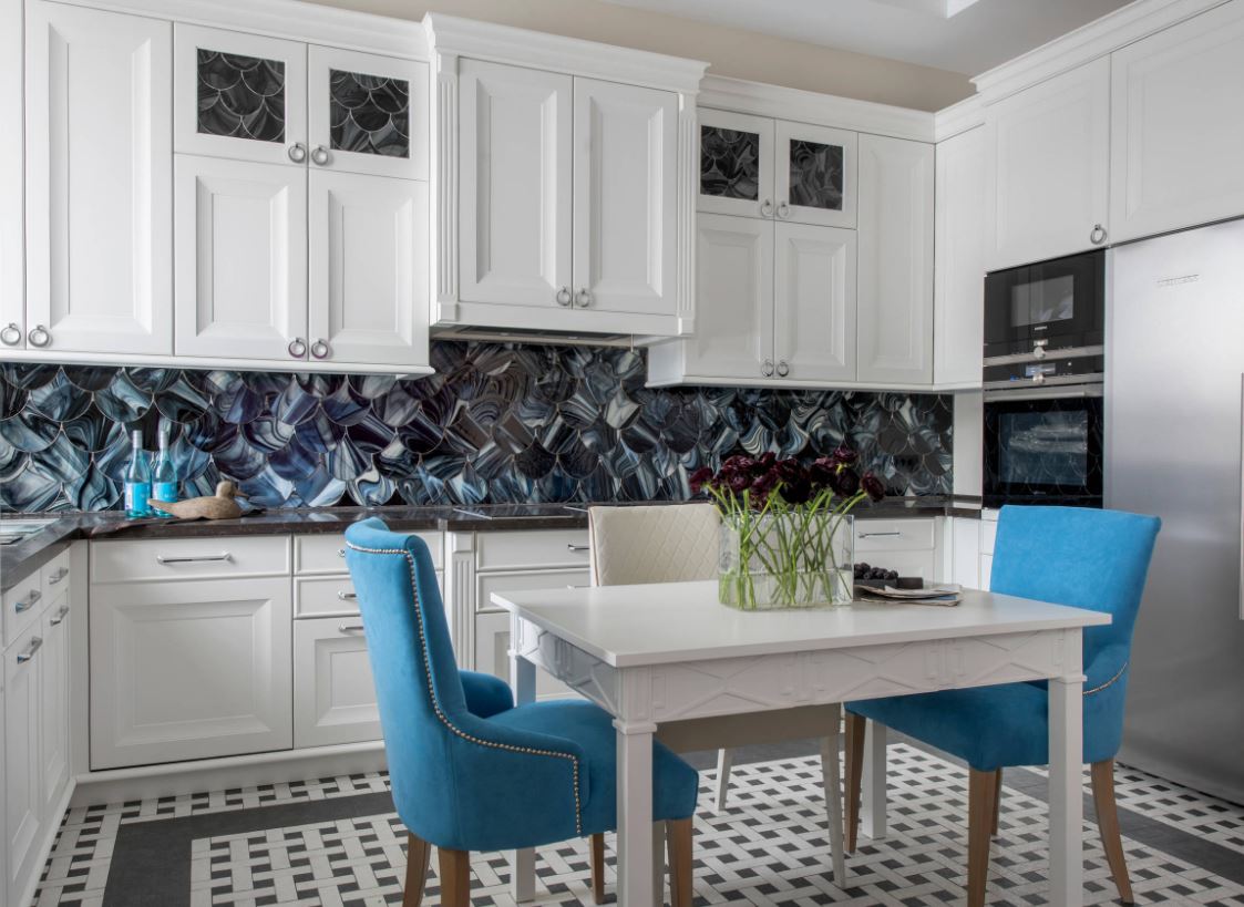 В этом случае гарнитур располагается по трем сторонам кухни, образуя букву «П». Планировка подойдет просторным помещениям и большим гарнитурам. При этом в одном из углов следует спланировать рабочий треугольник. А в центре кухни стоит установить обеденный стол со стульями.