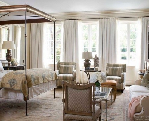 Традиционный набор мебели для спальни – это двуспальная кровать, комод с ящиками, две прикроватные тумбы, большой платяной шкаф и тумба или туалетный столик с зеркалом. Классический вариант кровати – это сооружение с большим высоким изголовьем, небольшим подножьем и боковыми панелями, выполненными в едином стиле. Кровать может быть украшена росписью, инкрустацией или резьбой. Традиционные прикроватные тумбы состоят из трех выдвижных ящиков, а ящики комода широкие и глубокие для вещей покрупнее. Также в состав гарнитура могут дополнительно входить тумбы или туалетные столики, за которыми очень удобно присесть возле зеркала.