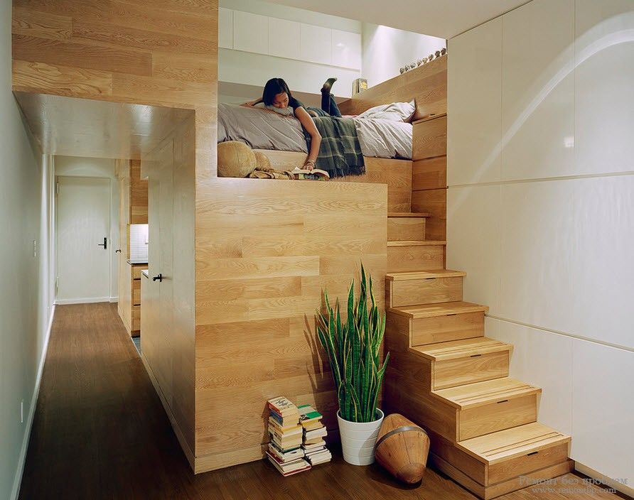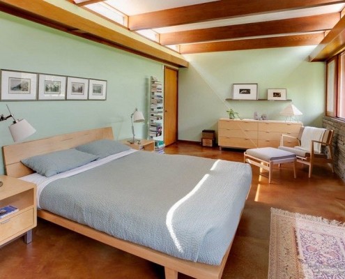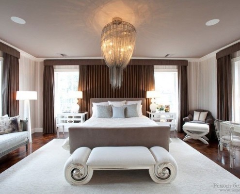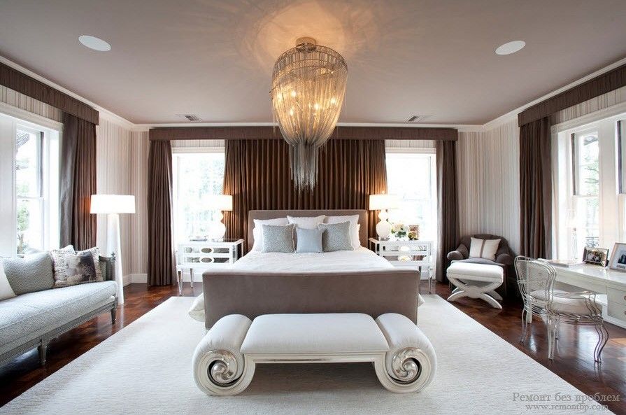 Спальня – это, прежде всего, место для отдыха и сна. Однако, по желанию хозяев интерьер можно дополнить баром, тренажером или библиотекой, правда, в таком случае крайне целесообразно произвести зонирование помещения, например, при помощи разного уровня пола или потолка или с помощью освещения.