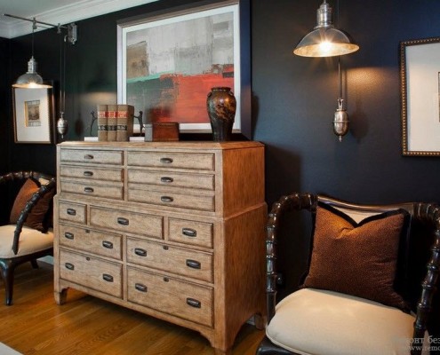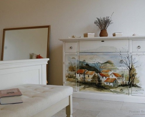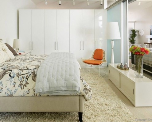 Шкафчик устанавливается после того, как установлена кровать. Он может быть отдельно стоящим или встроенным. Выбор места зависит от размеров и формы помещения. Например, если комната узкая с небольшим окном, не следует ставить шкафы вдоль длинной стены, т.к. помещение нужно наоборот укоротить, т.е. скорректировать его форму. Если комната небольшая, то от комода, например, лучше всего, вовсе отказаться и хранить белье в выдвигающихся ящиках кровати.