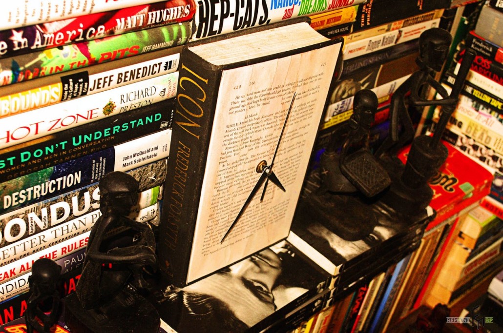 В последнее время стали популярными часы, имеющие нестандартную форму или изготовленные из непривычных для таких предметов материалов. Своеобразно выглядят часы, сделанные из книги. Такой аксессуар подчеркнет высокий интеллектуальный уровень хозяев и станет оригинальным украшением интерьера: