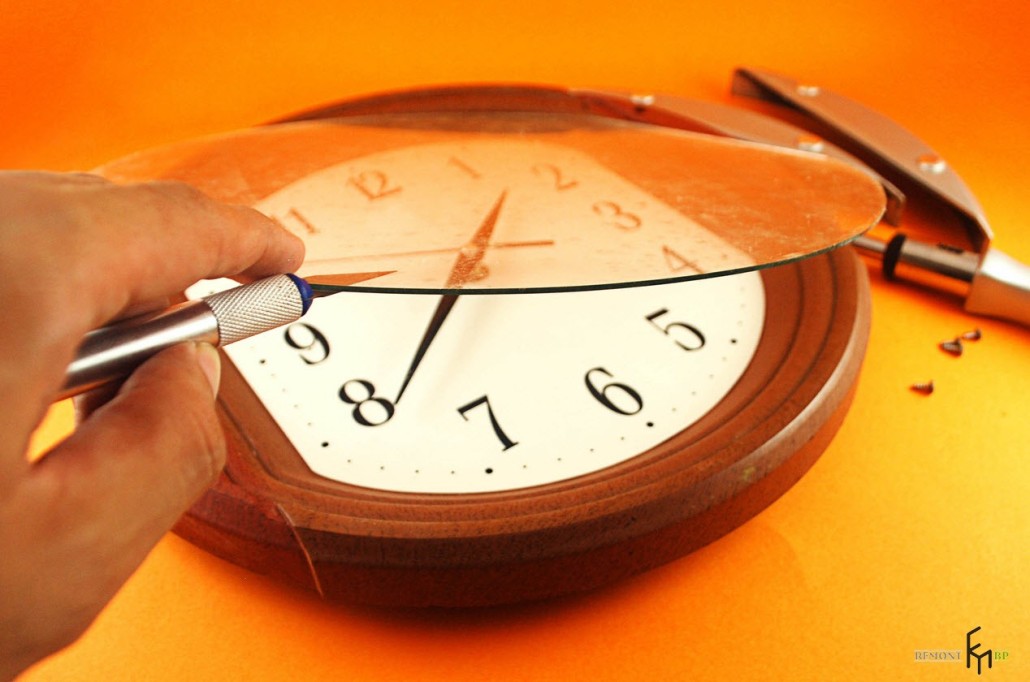 Аккуратно снимите стекло с часов при помощи специального ножа для точных работ, можно использовать канцелярский нож: