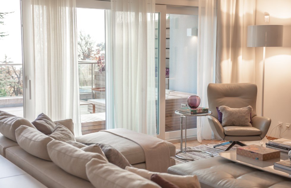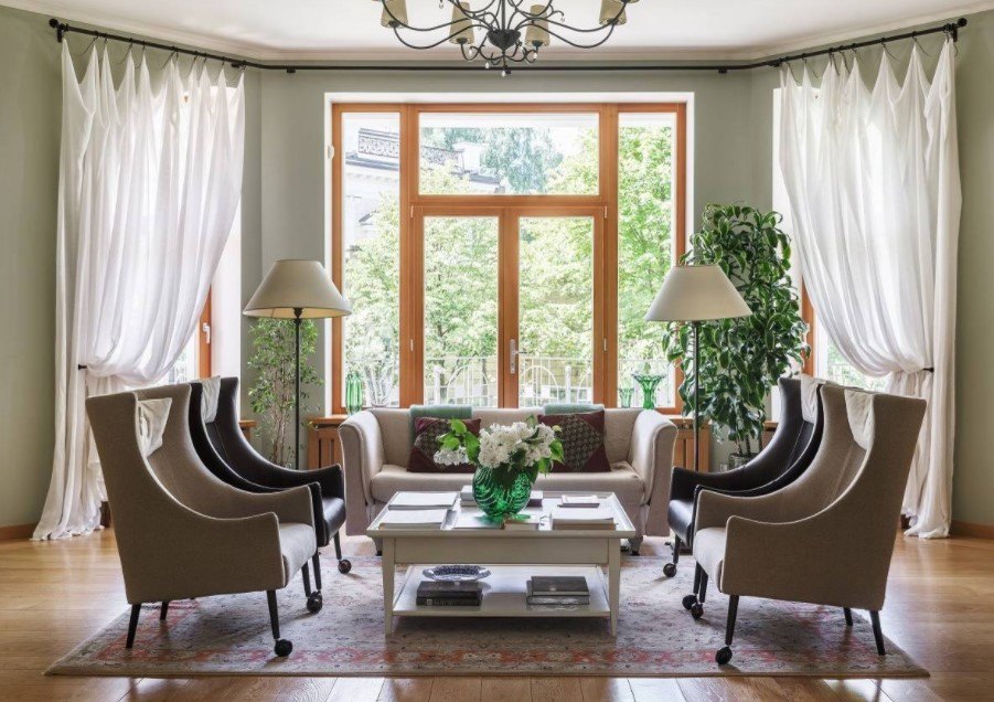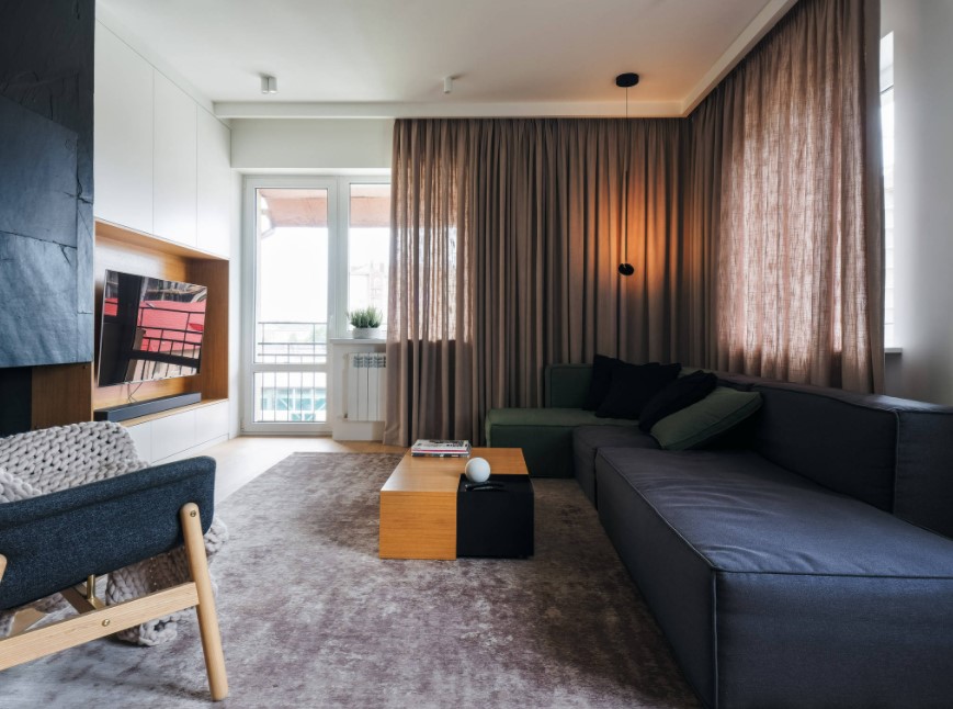 - Оконные шторки. Пустые окна, которые сейчас являются модным трендом, создают прохладную атмосферу. С неприкрытыми окнами человек чувствует себя не комфортно и беззащитно. Тем более, если квартира находится на нижних этажах дома и выходит окнами во двор или людную часть улицы. В этом случае все-таки стоит завесить проемы шторами или тюлем.
