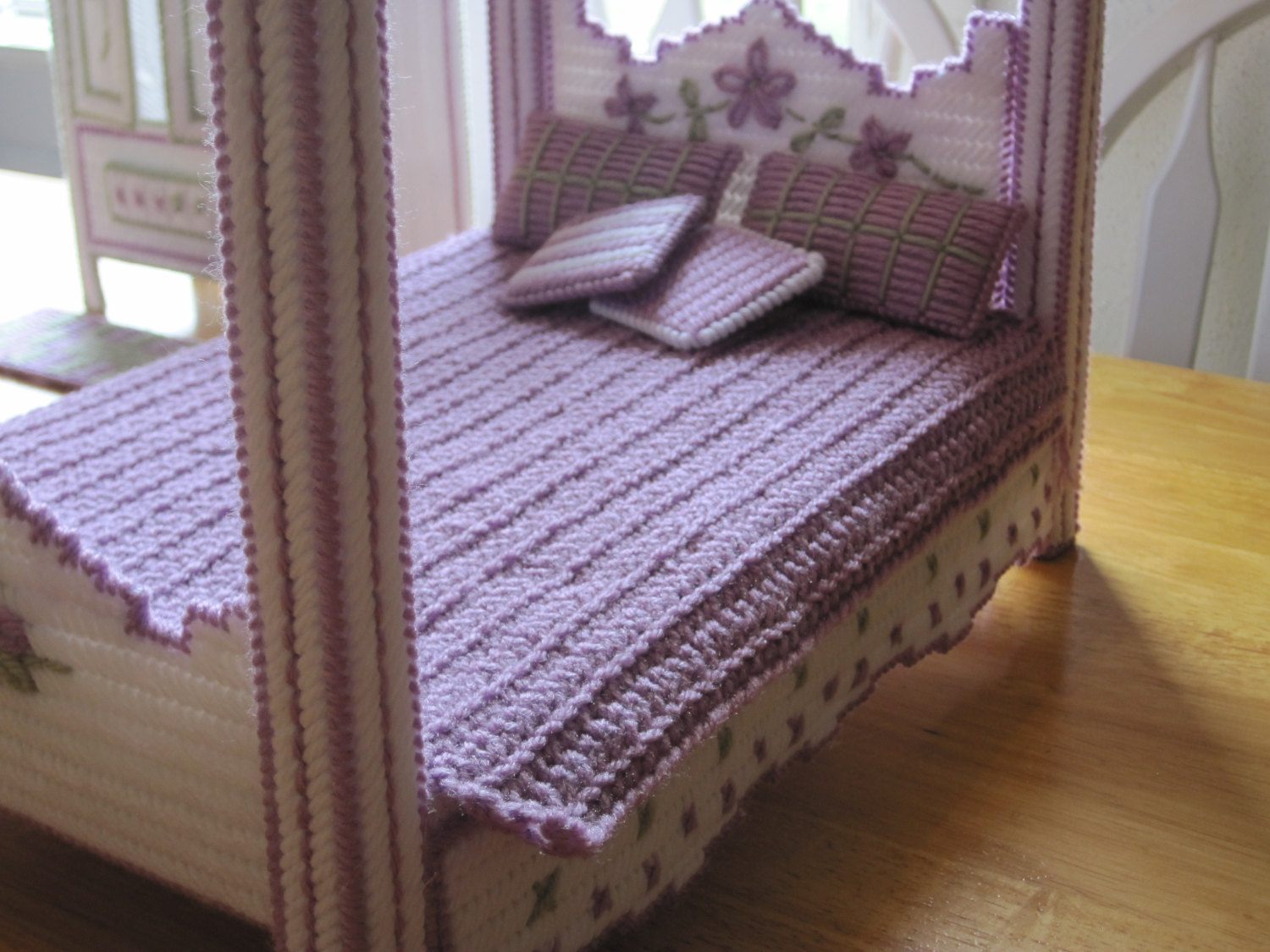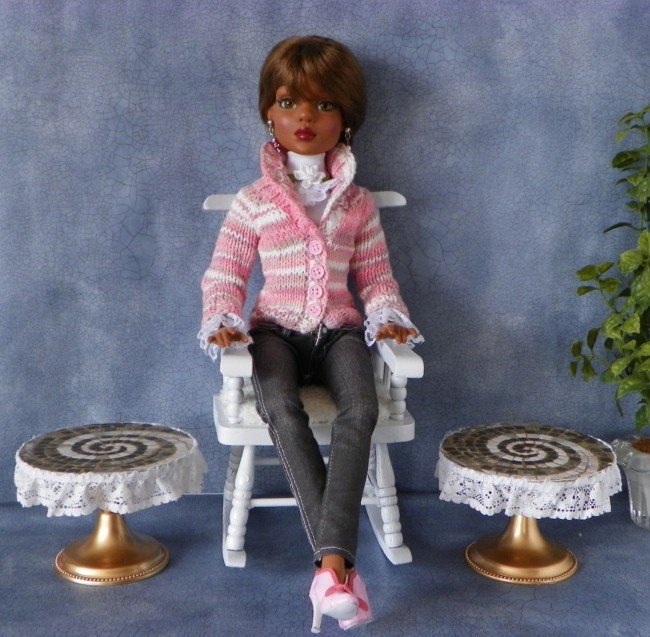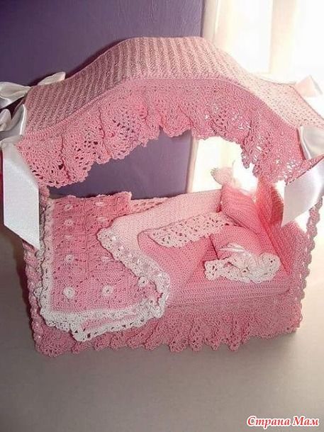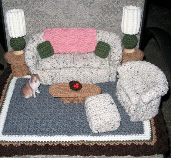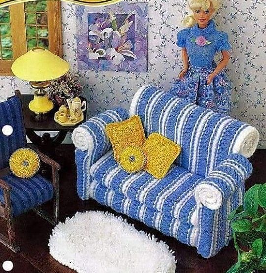 Очень мило, уютно и по-домашнему будет смотреться кукольная мебель, декорированная вязанными чехлами и прочими ажурными деталями.