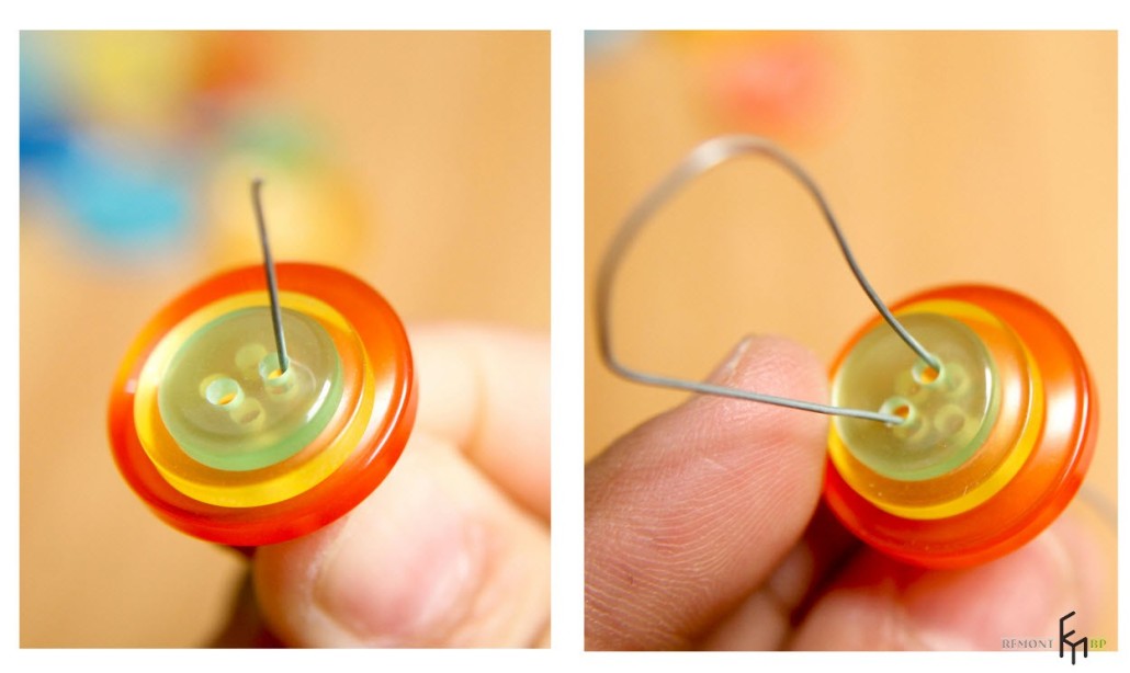 - Продеваем проволоку с нижней стороны через отверстия во всех трех пуговицах, затем сгибаем ее и выводим в отверстия сверху. Аккуратно обвейте проволоку под нижней пуговицей: