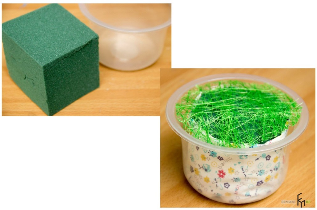 - Для вазы можно использовать любую емкость: стаканчики из-под мороженого, йогурта, бутылочки от соков или детского питания. В нашем случае в прозрачный пластиковый стаканчик вставляем губку, предварительно придав ей форму емкости. Губку можно обернуть яркой упаковочной бумагой, фольгой или тканью. Сверху приклейте искусственный мох или траву, куда будут вставлены наши цветы: