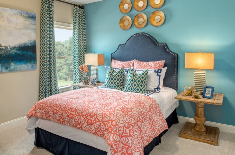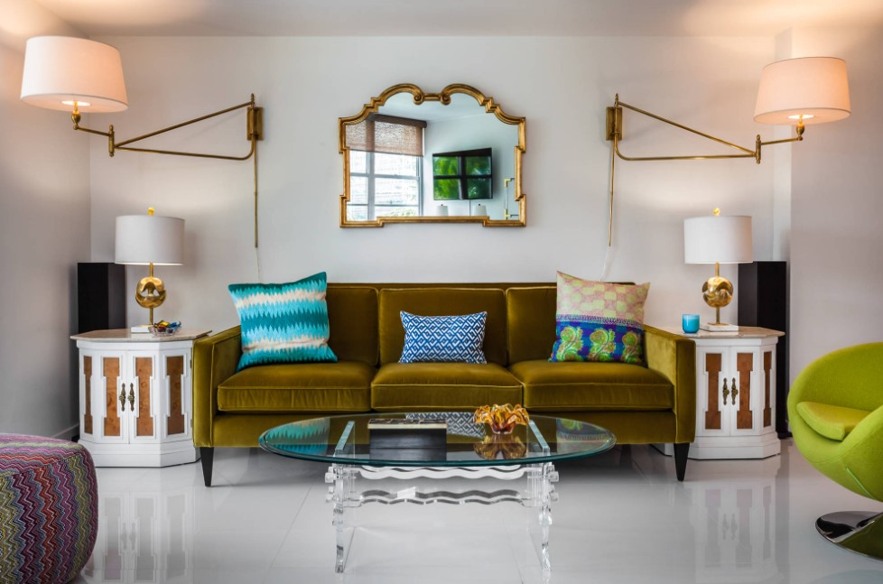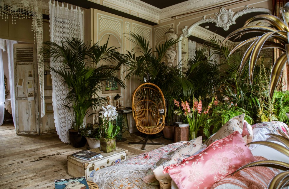 Стиль подразумевает яркие цветовые акценты, в том числе сиреневы, малиновый, бирюзовый и золотой. В интерьере допустимо использовать растительные и анималистические детали, в том числе узоры на текстиле или фигурки.