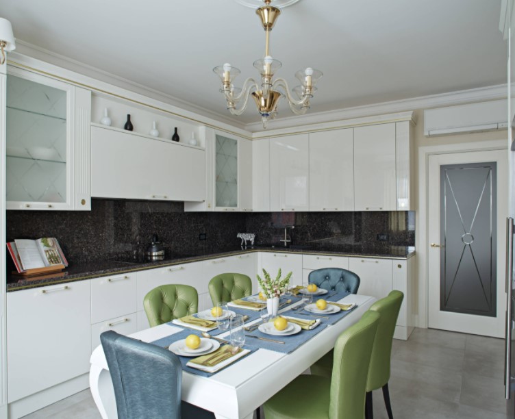 В цветовой гамме преобладают пастельные тона. Дополнять дизайн стоит различными аксессуарами. Например, плиссированными шторами, пластиковыми стульями, антикварными вещицами, коллекционными картинами, статуэтками из фарфора и другим. В таком интерьер не обойтись без дорогостоящих дополнений, вроде кожаной обивки, шелковых обоев и антиквариата.