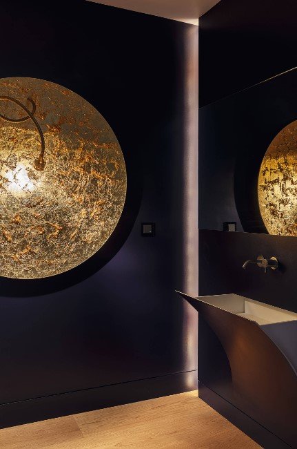 Кроме того, подсветкой можно оснастить даже пол, который в дизайнах также подсвечивают светодиодной лентой, люминисцентным кафелем, неоновыми «плинтусами», точечными светильниками. Но при этом гидроизоляция должна быть на высоте, иначе взаимодействие электроприборов с водой грозит несчастными случаями и некрасивым «обгоревшим» интерьером.