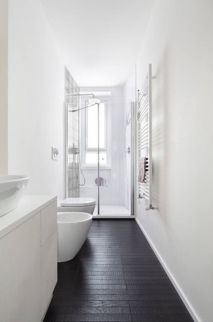Также дизайнеры рекомендуют убрать из узкого интерьера лишние предметы, мелкие аксессуары, избавиться от повсеместного мозаичного рисунка. Визуальный простор сможет обеспечить только максимальный минимализм. А предметы мебели лучше выбирать с закругленными углами, чтобы снизит уровень травматичности. Для мебели стоит использовать открытые полки, чтобы не нужно было находить место для открывающихся дверец. От стиральной машинки возможно придется избавиться в пользу кухни или прихожей. Но для нее также можно найти место под раковиной, если мойка установлена по способу скрытого монтажа.