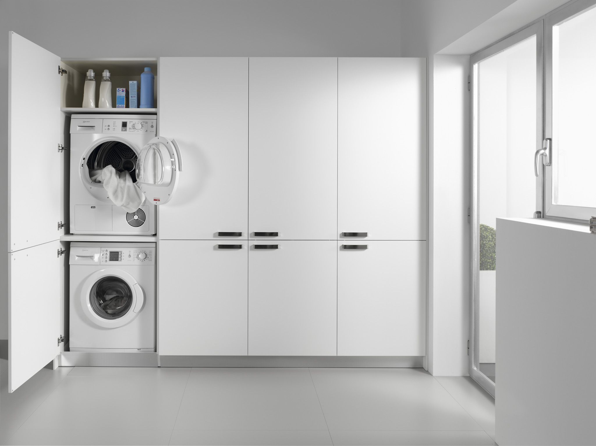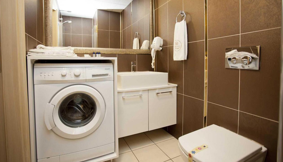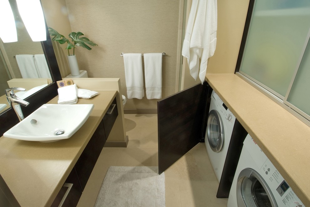Размещение стиральной машины в тумбе, находящейся в ванной комнате, пожалуй, самый простой и доступный вариант. В данном случае наиболее подходящим решением станет приобретение полно встраиваемой машины для стирки. Для такого вида стиральных машин характерны: наличие крепления для дверцы на передней стенке корпуса с левой и правой стороны, пазы для встраивания на задней стенке, эргономичная вогнутая или плоская дверца люка, отсутствие выступающих деталей приборной панели.