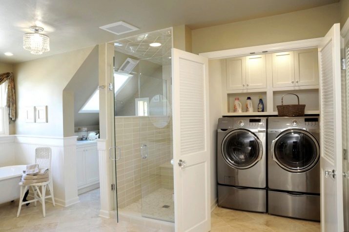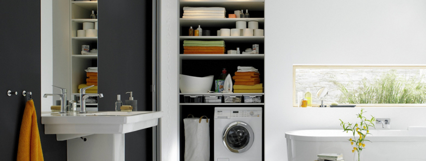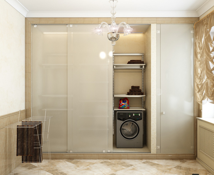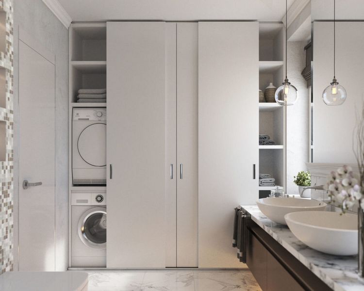 В некоторых проектах многоквартирных жилых домов предусмотрена ниша в ванной комнате. Ее можно использовать для установки распашного шкафа по индивидуальным размерам. Именно в этом шкафу легко и достаточно просто можно разместить стиральную машину, а также оборудовать полки для хранения бытовой химии, хозяйственных принадлежностей или сушильной машины. Такое решение обеспечит бережное и аккуратное хранение бытовой техники, отлично впишется в интерьер ванной комнаты, создаст благоприятную атмосферу порядка и чистоты.