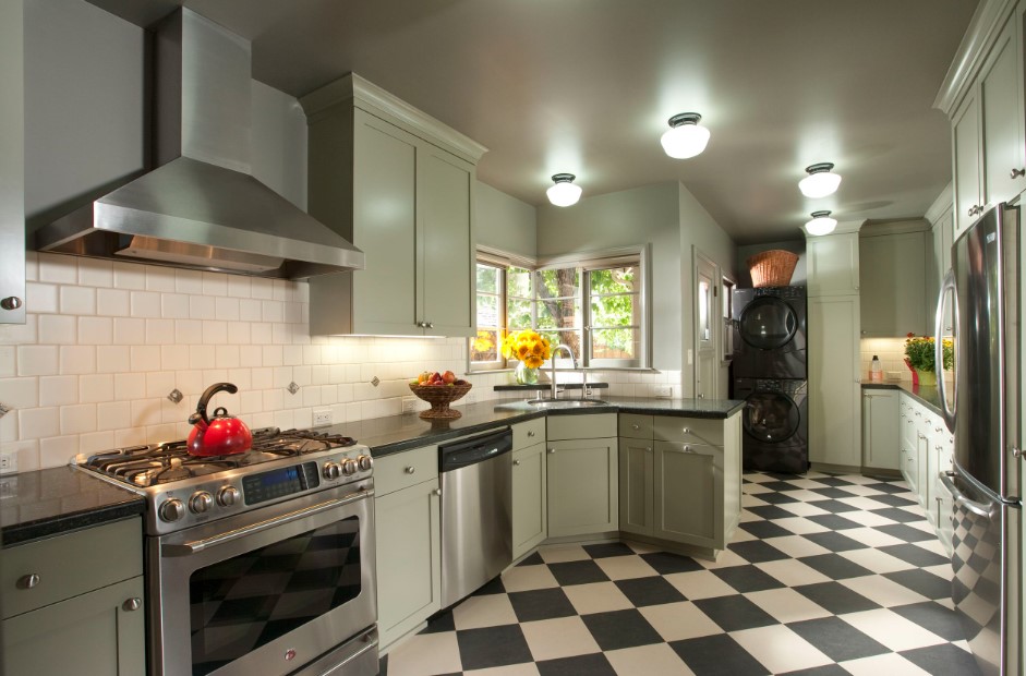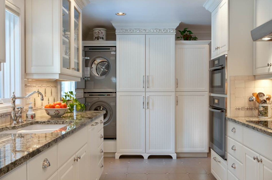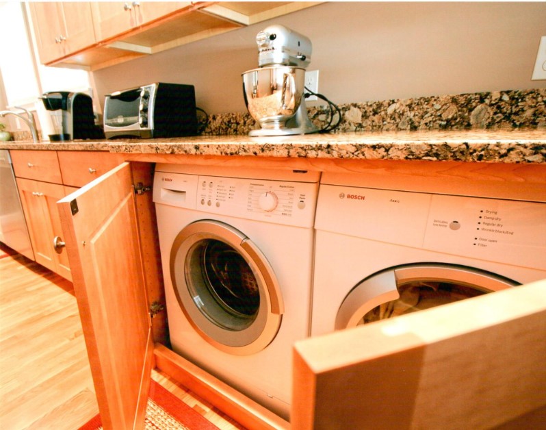 Если принято продуманное и обусловленное жилищными условиями решение разместить стиральную машину на кухне, то один из самых простых и недорогих способов – это спрятать ее под столешницей кухонного гарнитура. В этом случае, не нарушается общее восприятие интерьера кухни, особенно если, машина для стирки находится не просто под столешницей, а еще дополнительно закрыта с помощью мобильной декоративной перегородки или полотна-шторки, которое будет соответствовать выбранному стилю кухонного интерьера. Такой вариант требует предварительной подготовки: нужно предусмотреть данное решение при заказе кухонного гарнитура и продумать технические вопросы, связанные с электропитанием и водоснабжением.