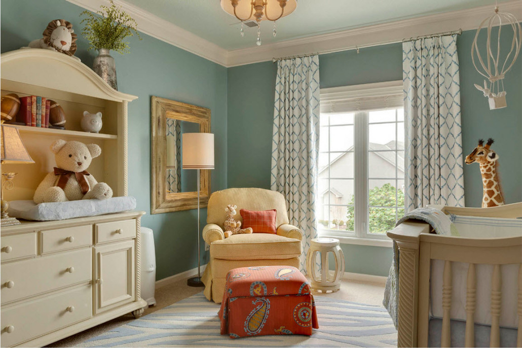 3. Цветовая палитра и рисунок. Цветовое оформление детской – дело вашего вкуса и личных предпочтений. Консервативные родители, как правило, выбирают нейтральные тона, такие как бежевый, кремовый, белый, бледно-зеленый или нежно-голубой.