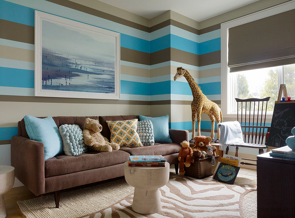 Что же касается игрушек и аксессуаров, то это уже совсем другая история. Для маленького непоседы вполне достаточно будет пары мягких плюшевых мишек, милого рисунка на стене, доски для проявления художественного начала и нескольких ярких декоративных подушечек.