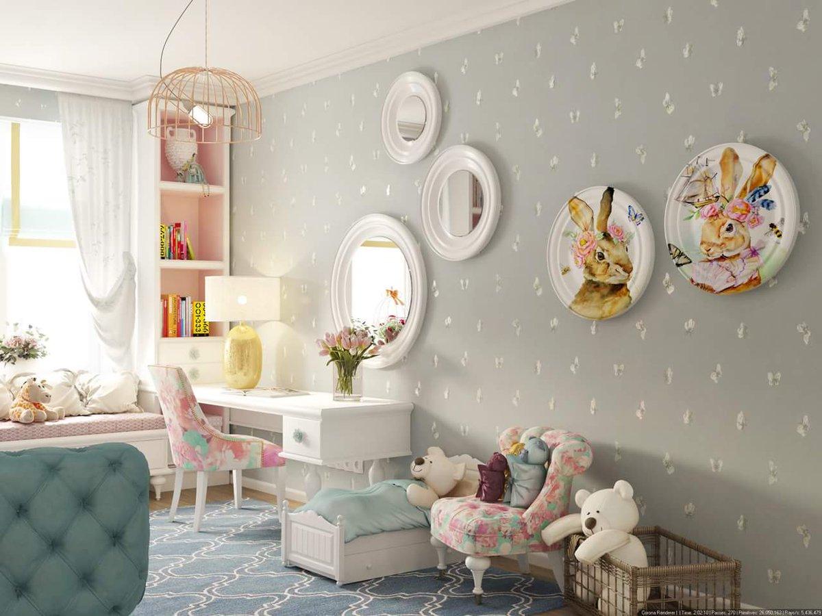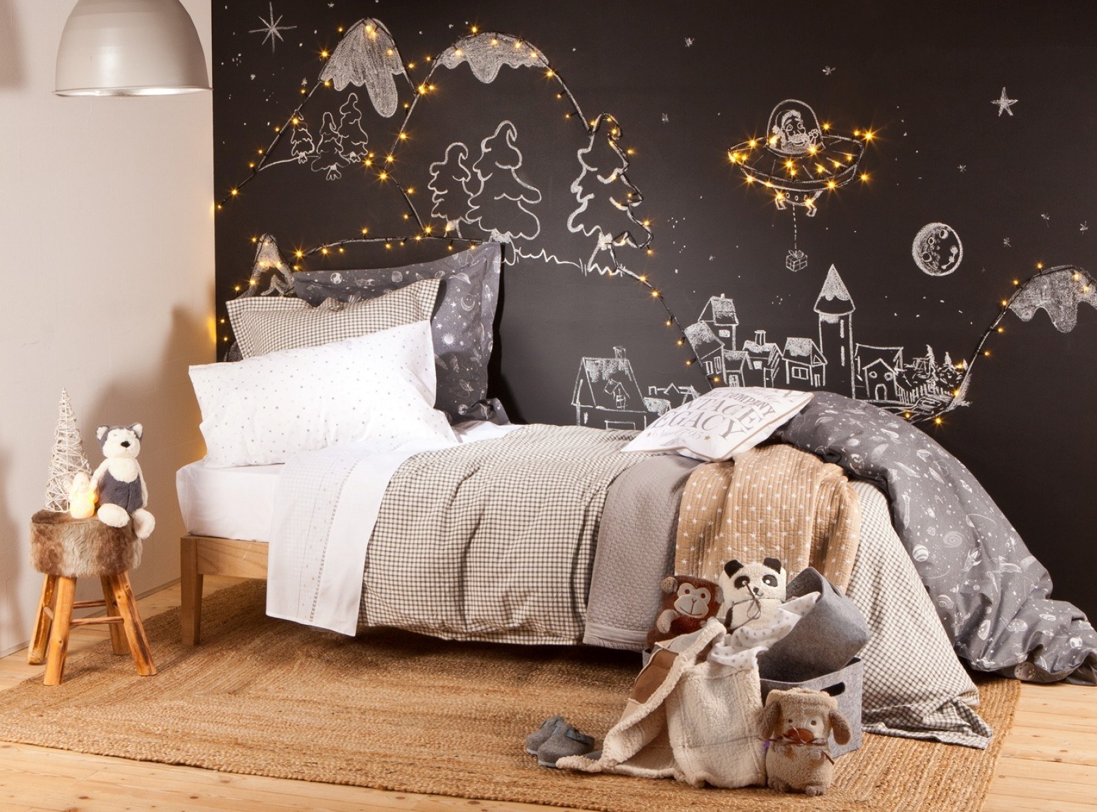 Размещение декора на стенах в детской пользуется большой популярностью, поскольку такой вариант создаёт уютную атмосферу и не мешает во время передвижения. А самое главное, его не нужно заново расставлять по полкам после того, как ребёнок решил с ним поиграть. Наиболее простыми примерами в этом случае можно назвать рисунки на стенах, о чём мы уже упоминали выше и гирлянды, которые можно использовать не только в качестве украшения, но и как подсветку в ночное время.