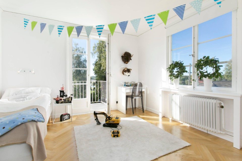Здесь важно учитывать пожелания ребёнка и постараться раскрыть его способности. Исходя из этого роль декора может выполнять как балдахин у изголовья кровати, так и шалаш либо полноценный домик, яркие гирлянды из флажков либо наклейки животных и цветов на стенах. На полу можно постелить коврики оригинальной формы, а вместо магазинных покрывал использовать изделия ручной работы в стиле пэчворк либо вязаные пледы.
