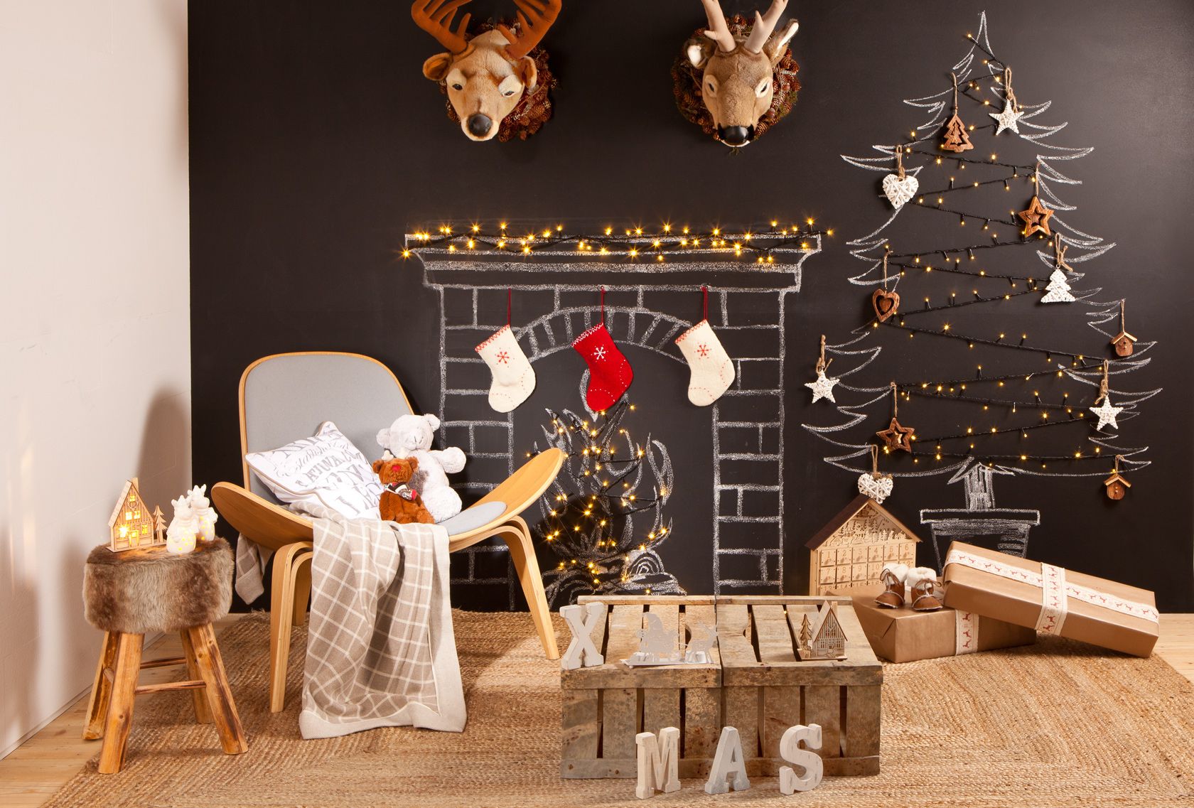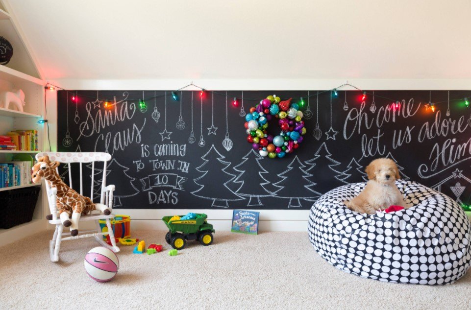Дети очень любят рисовать, что можно также использовать в качестве декора. Кстати ёлочку можно также нарисовать на грифельной доске либо сделать её контур на стене из ниток или дождика.