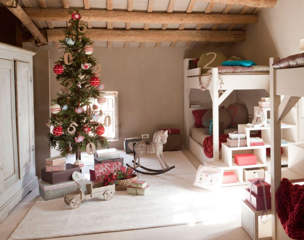 Незаменимым спутником Нового года является ёлка. Однако если площадь помещения не позволяет установить в детской этот атрибут, можно воспользоваться миниатюрной новогодней композицией из еловых веток либо попросту украсить помещение при помощи гирлянд, снеговиков, ангелов и снежинок из бумаги, которые, кстати, вы можете изготовить вместе с ребёнком.