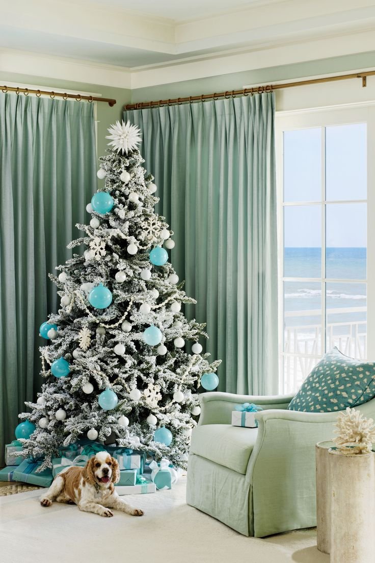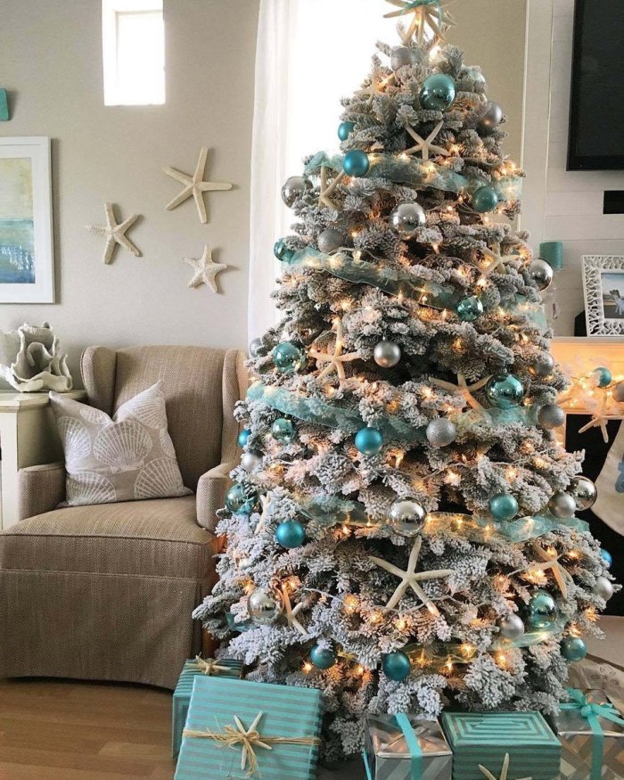 Довольно оригинально будет смотреться елочка, оформленная в морской технике. Для этого подойдут игрушки в морской тематике: ракушки, звезды или морские коньки в тандеме с синим цветом. А у основания елочки допустимо сложить морскую гальку, если такая имеется в наличии.